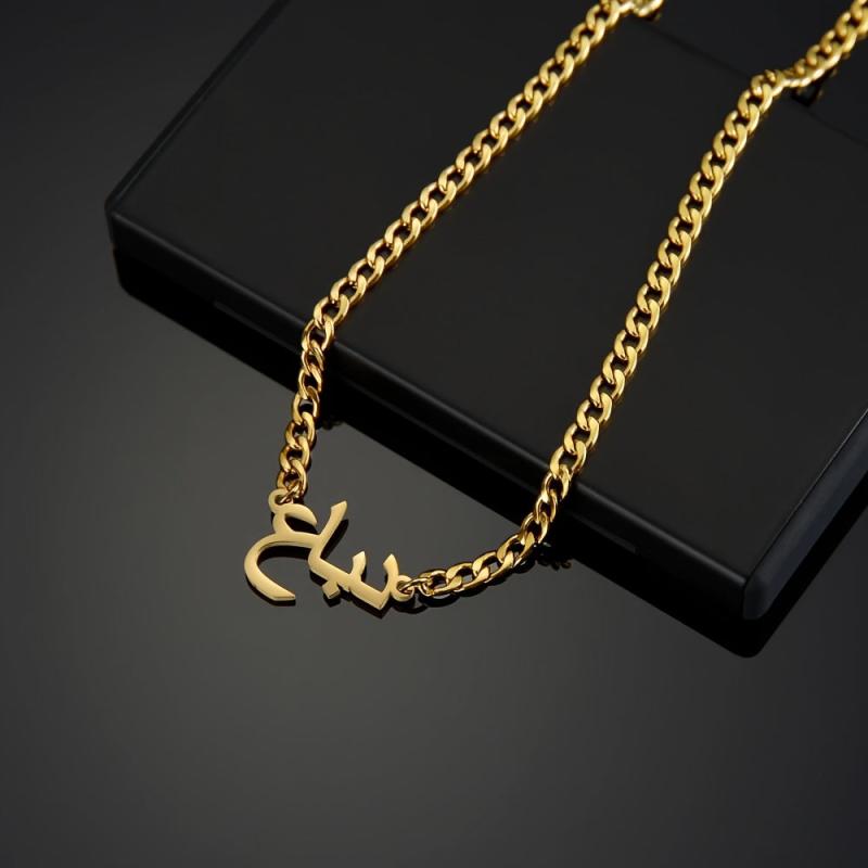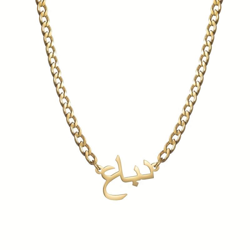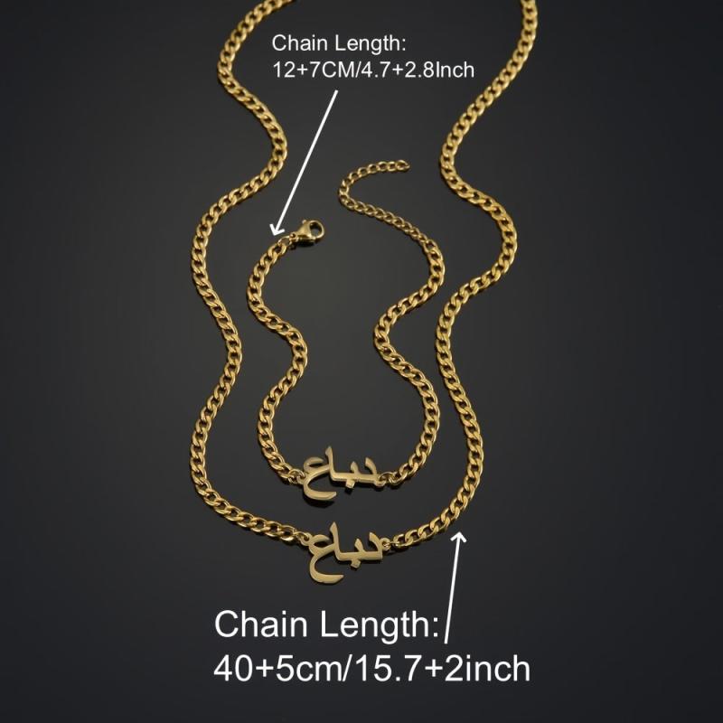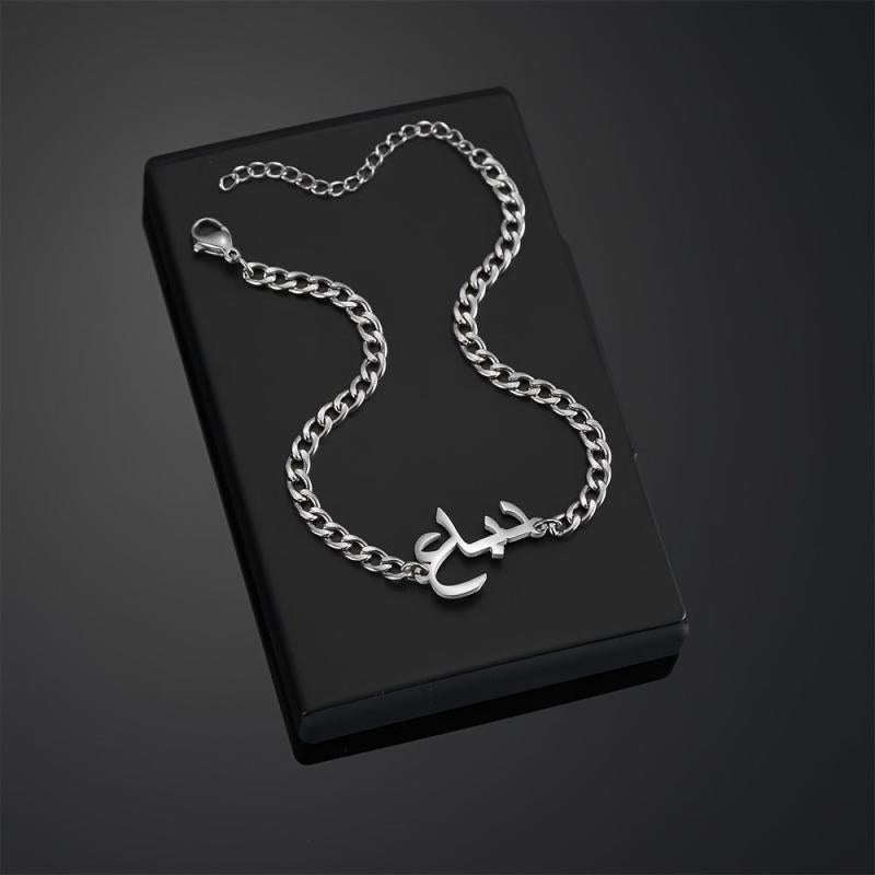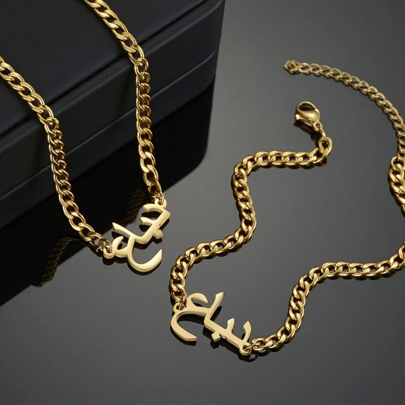 Get this unique Arabic Name Necklace & Bracelet Set in tribal style. Made of high-quality stainless steel, this set can be personalized with your name or a loved one's name.