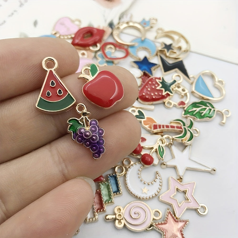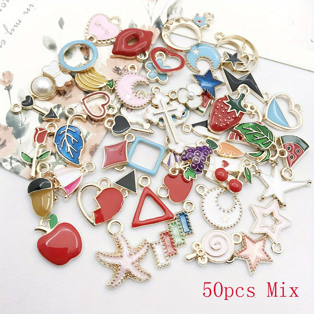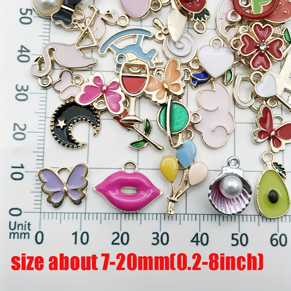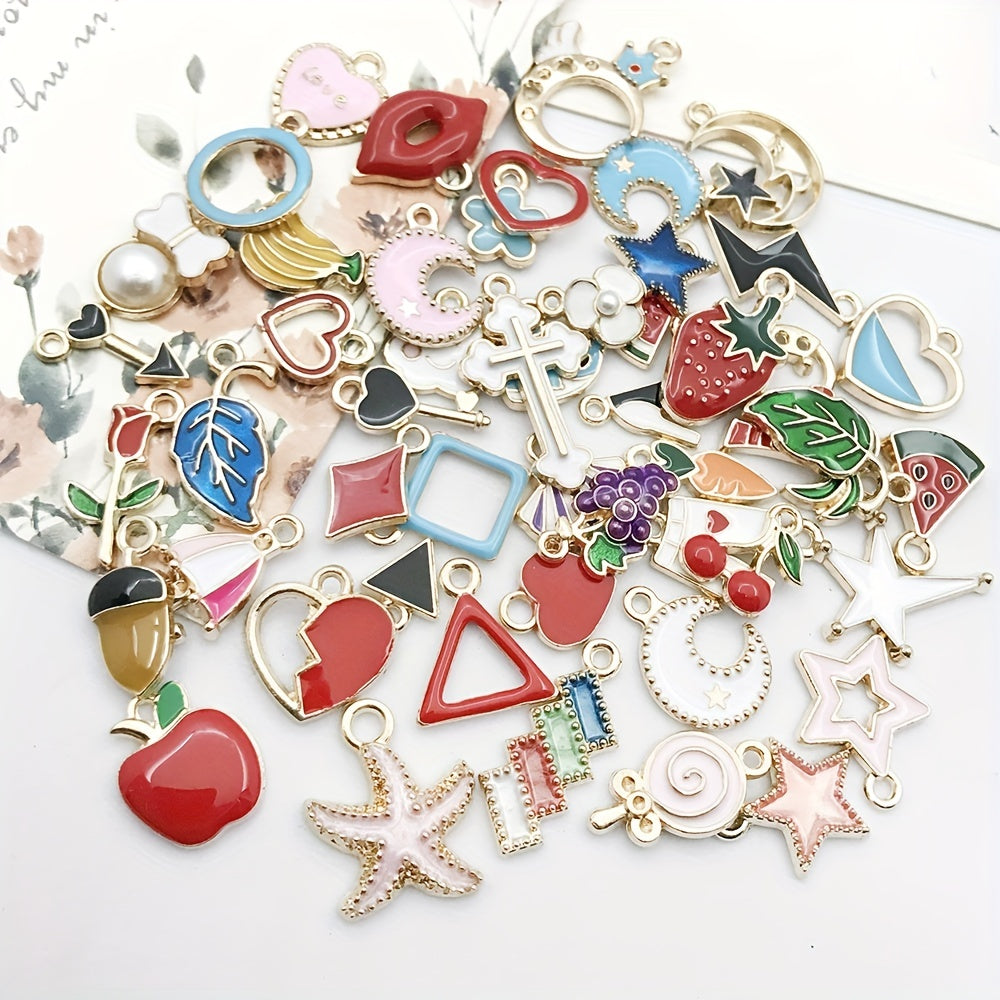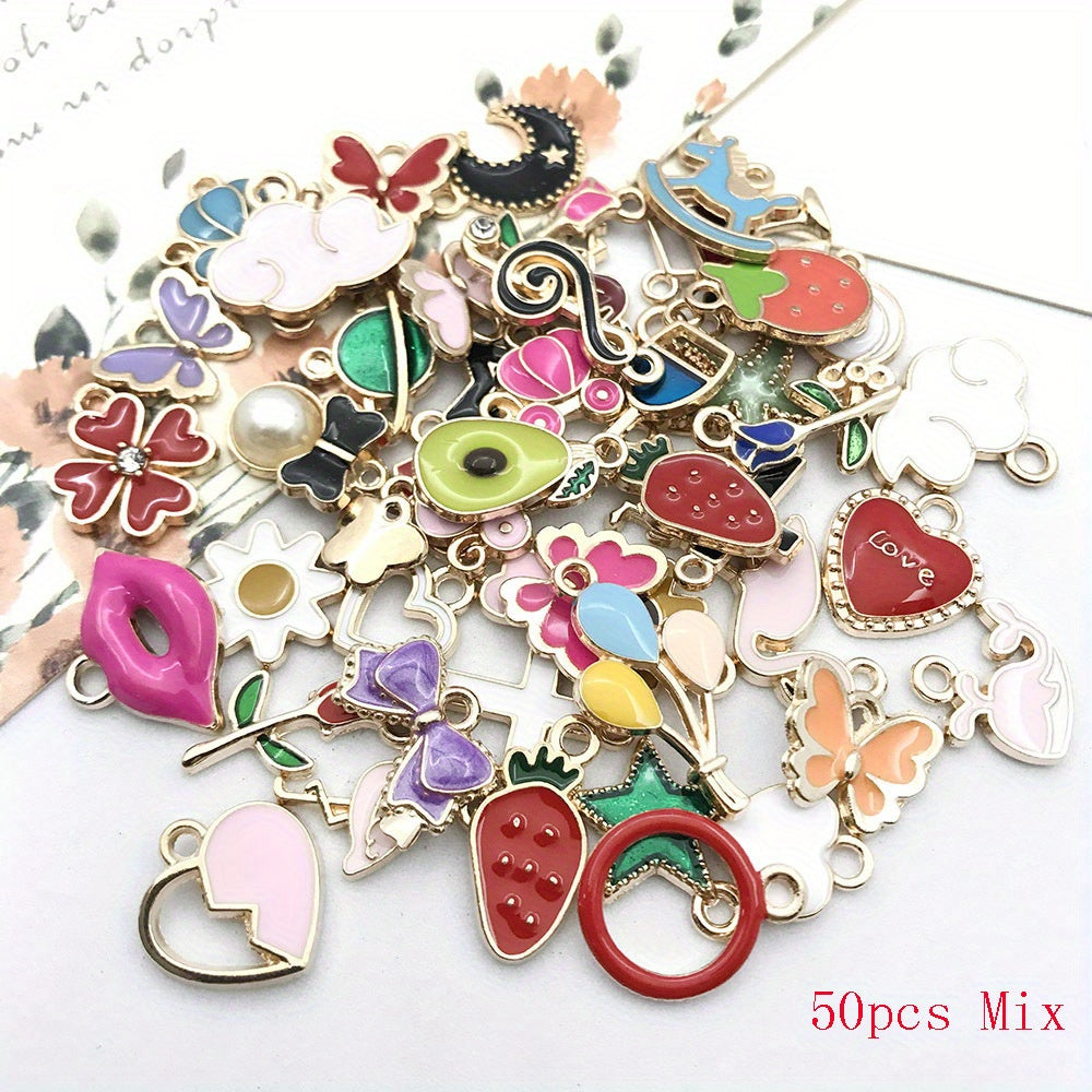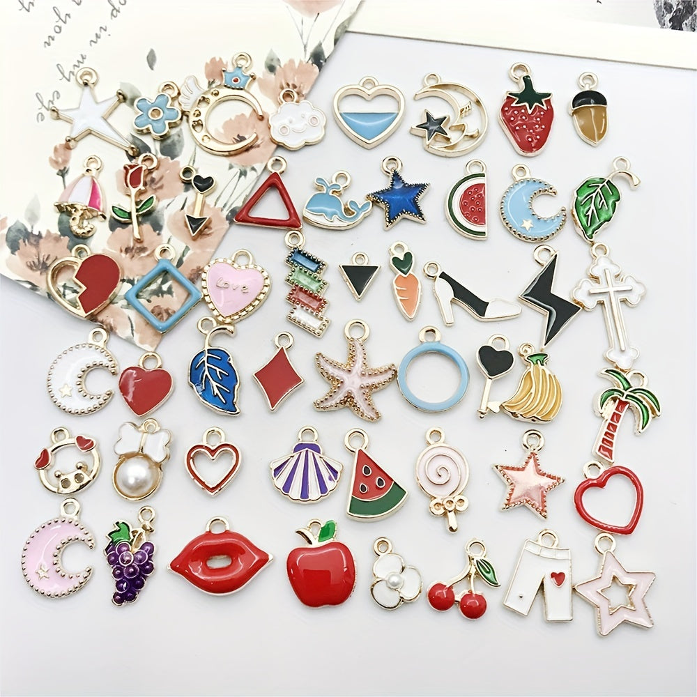 Explore your creativity with this set of 50 assorted enamel charms for DIY necklace, bracelet, and earring projects. Each charm is beautifully crafted and gold plated, perfect for craft supplies.