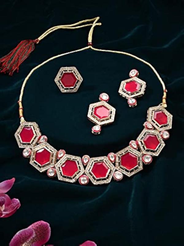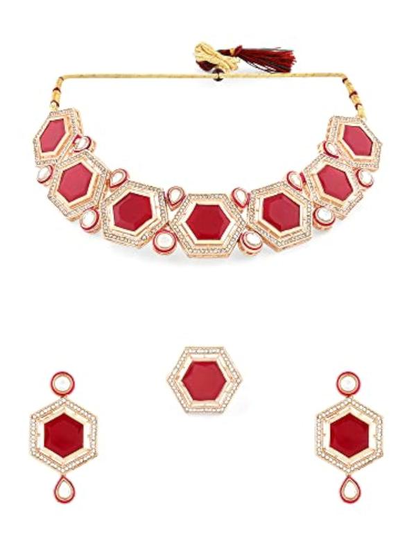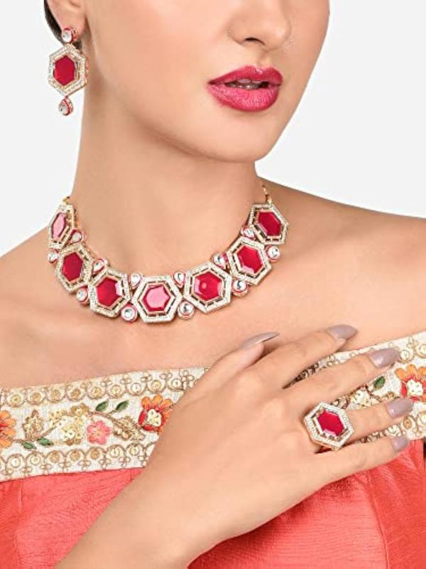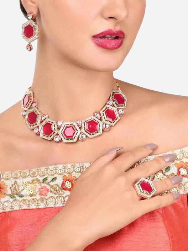Elegant set featuring necklace, earrings, and ring with Austrian diamonds and Kundan accents.