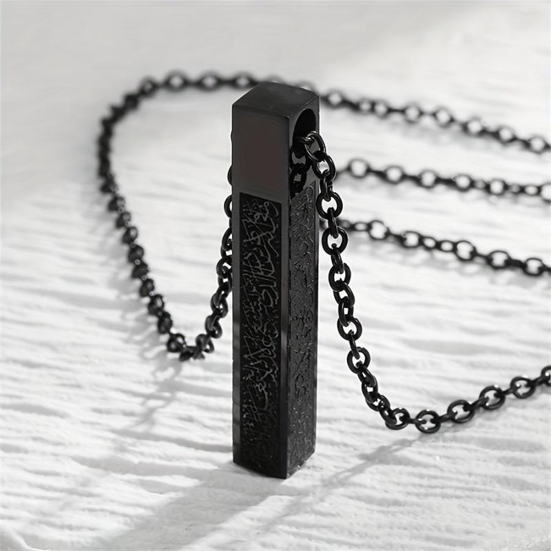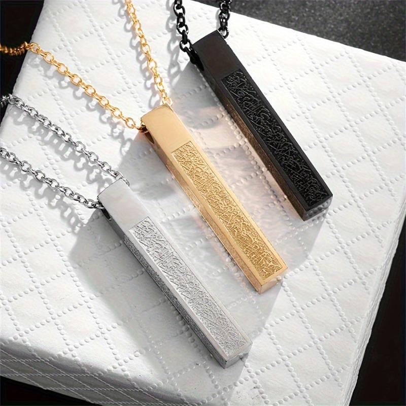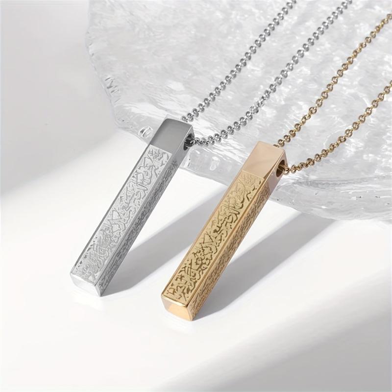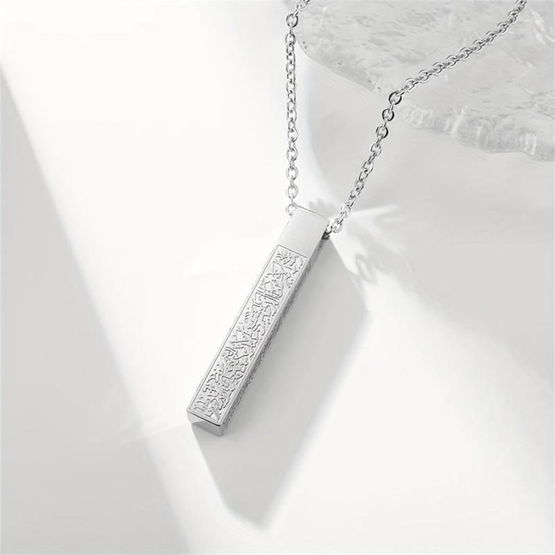 Stylish necklace featuring Ayatul Kursi Islamic cube pendant, perfect for men and women. Made of durable stainless steel with intricate Arabic calligraphy. Ideal gift for Eid celebrations.