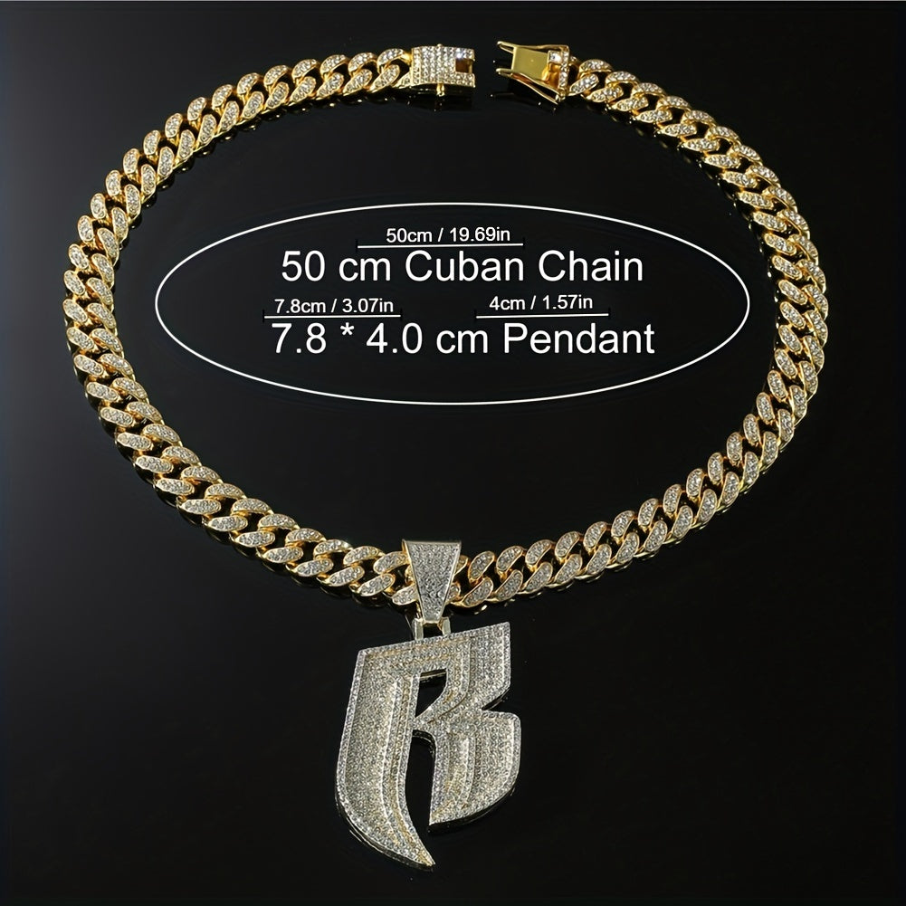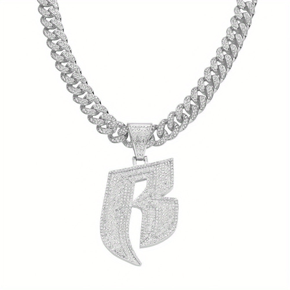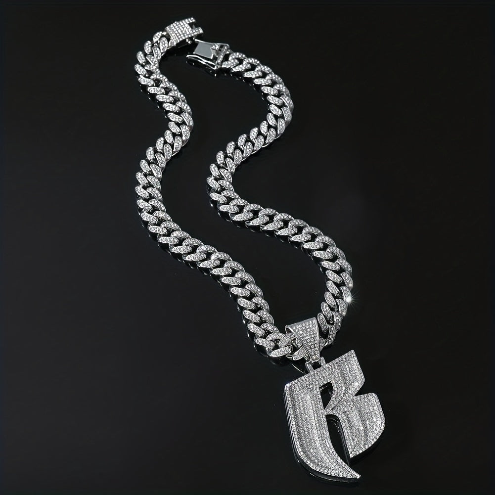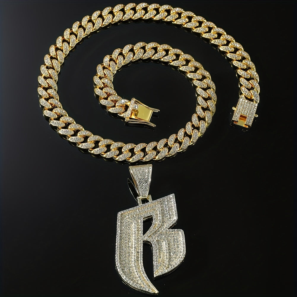 Stylish necklace featuring a B initial pendant with rhinestones on a Cuban link chain.