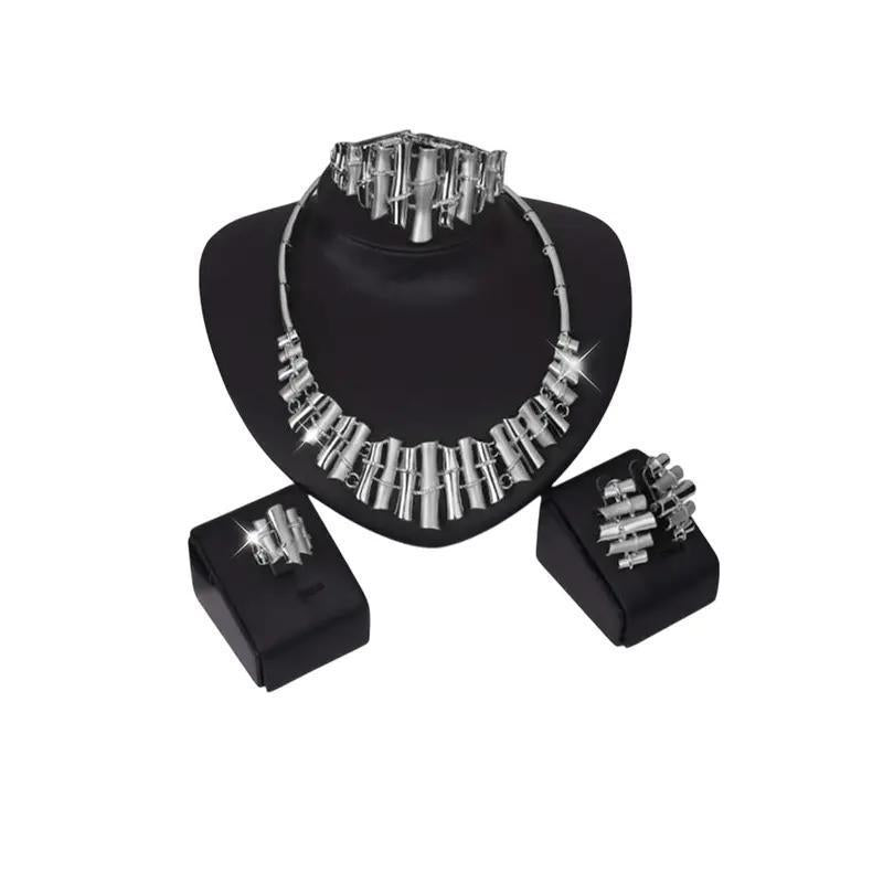 Elegant and modern bamboo-inspired silvery jewelry set featuring a necklace, bracelet, earrings, and a ring. Perfect for adding a touch of sophistication to any outfit.