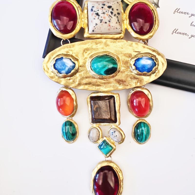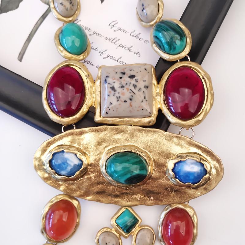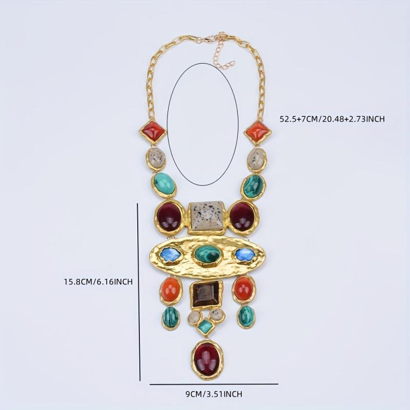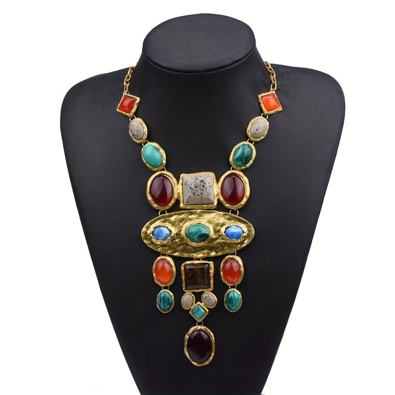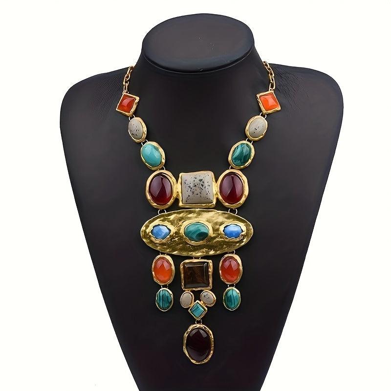 Make a statement with this chic and vibrant strand necklace adorned with colorful gemstones. Perfect for parties, festivals, and carnival year celebrations.