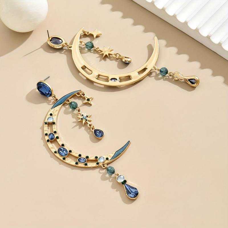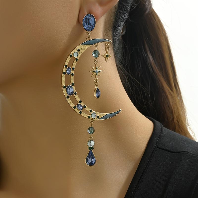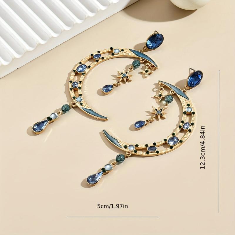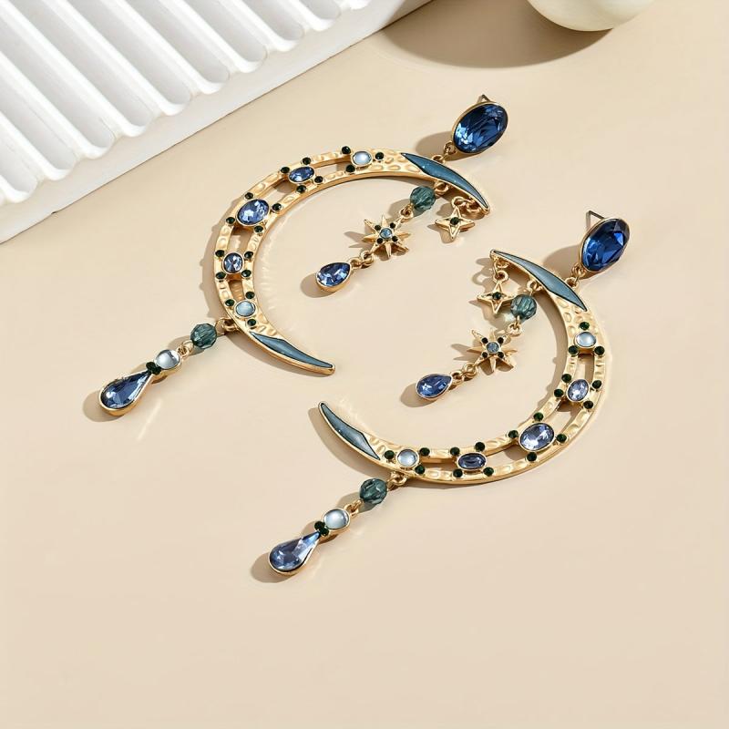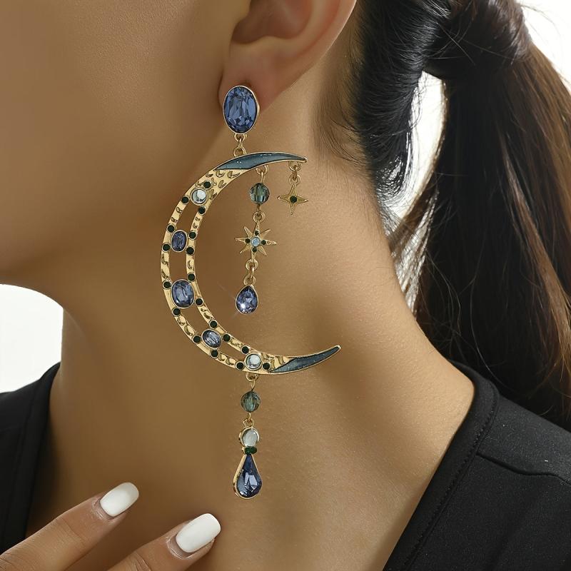 Make a statement with these Baroque style crescent moon earrings featuring green gemstones and golden tone metal. Perfect for parties, weddings, and formal events.