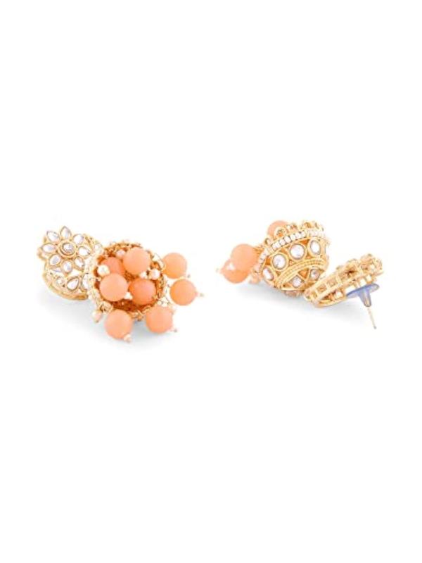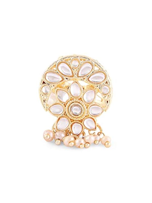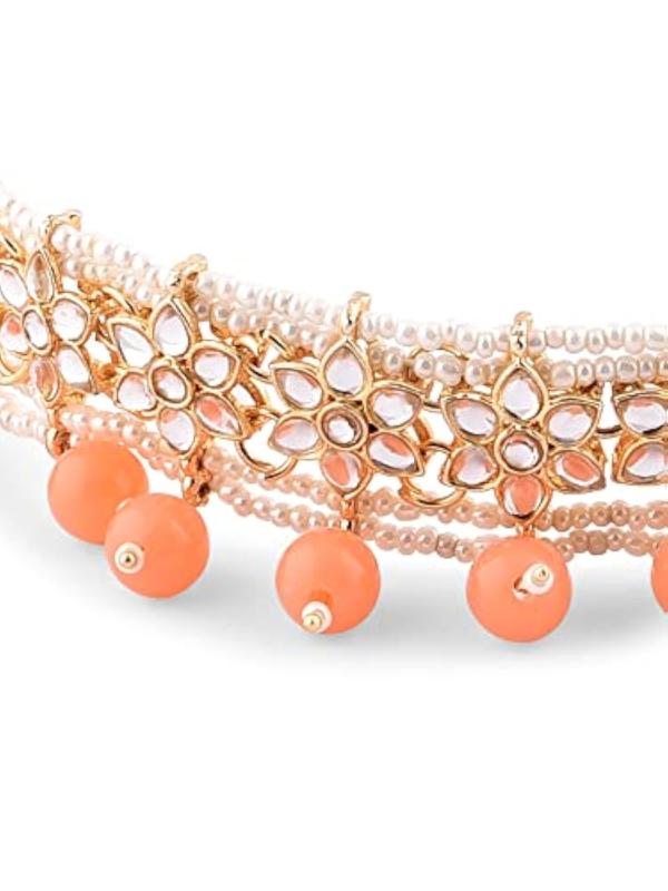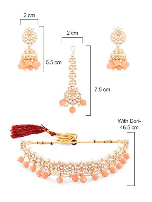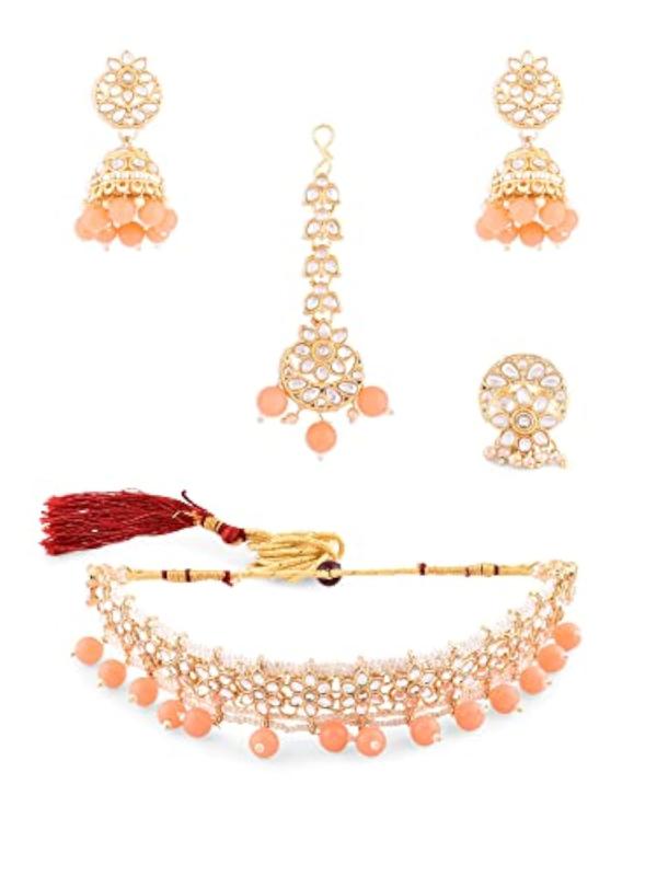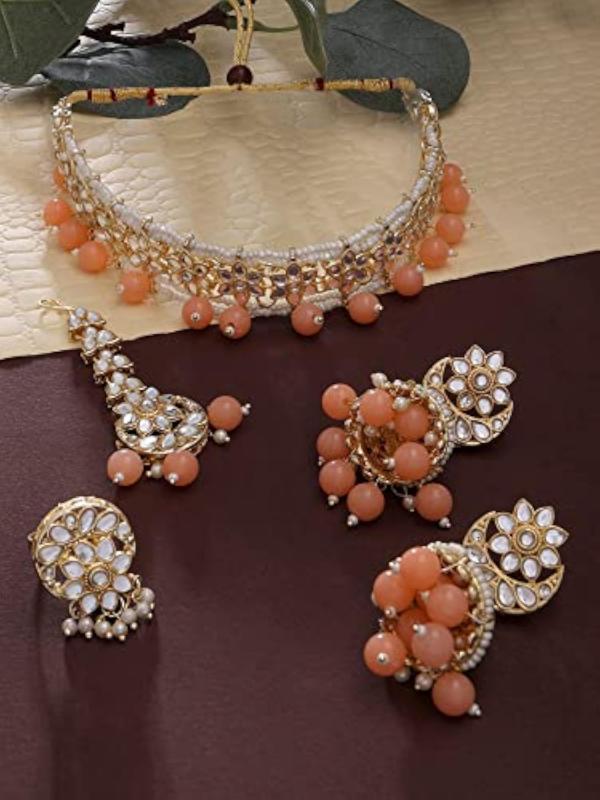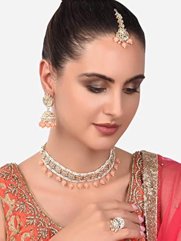 Elegant beads Kundan choker necklace set with maangtikka, earrings, and ring for women.