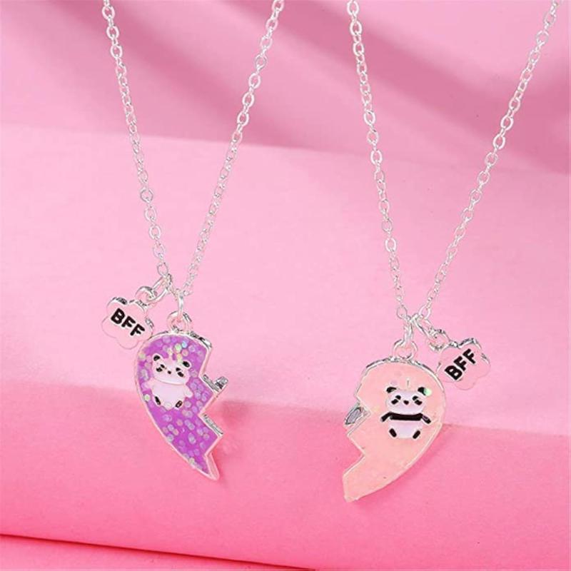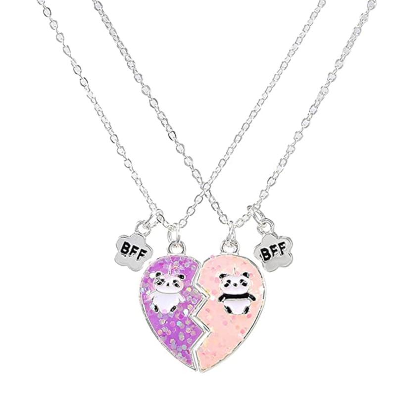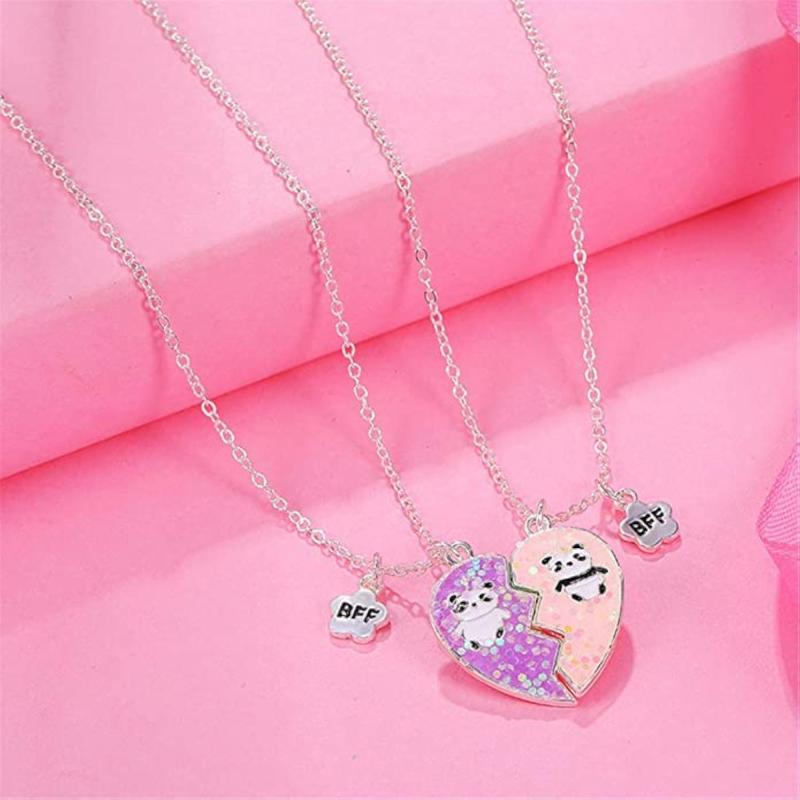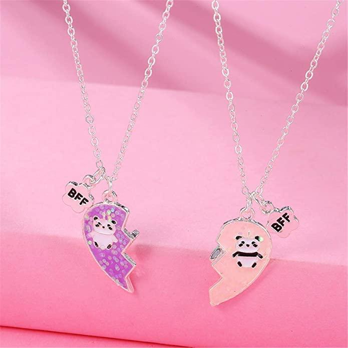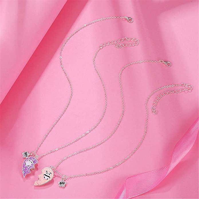 This BFF pendant necklace set features rainbow hearts design, perfect for best friends forever. The magnetic split design allows each friend to wear a piece of the pendant. It includes mermaid shells, unicorns, and butterflies for a magical touch.