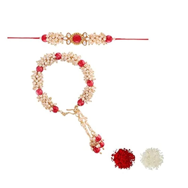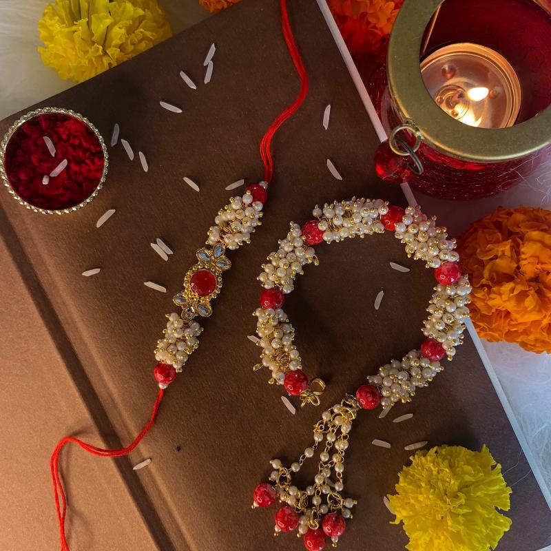 Celebrate Rakshabandhan with this beautiful set of Lumba Rakhis for Bhaiya and Bhabhi. Includes Roli Chawal for the perfect ceremony.
