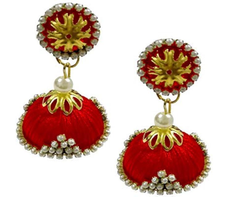 Elegant jhumki earrings made with plastic beads and silk dori, perfect for formal or casual occasions.