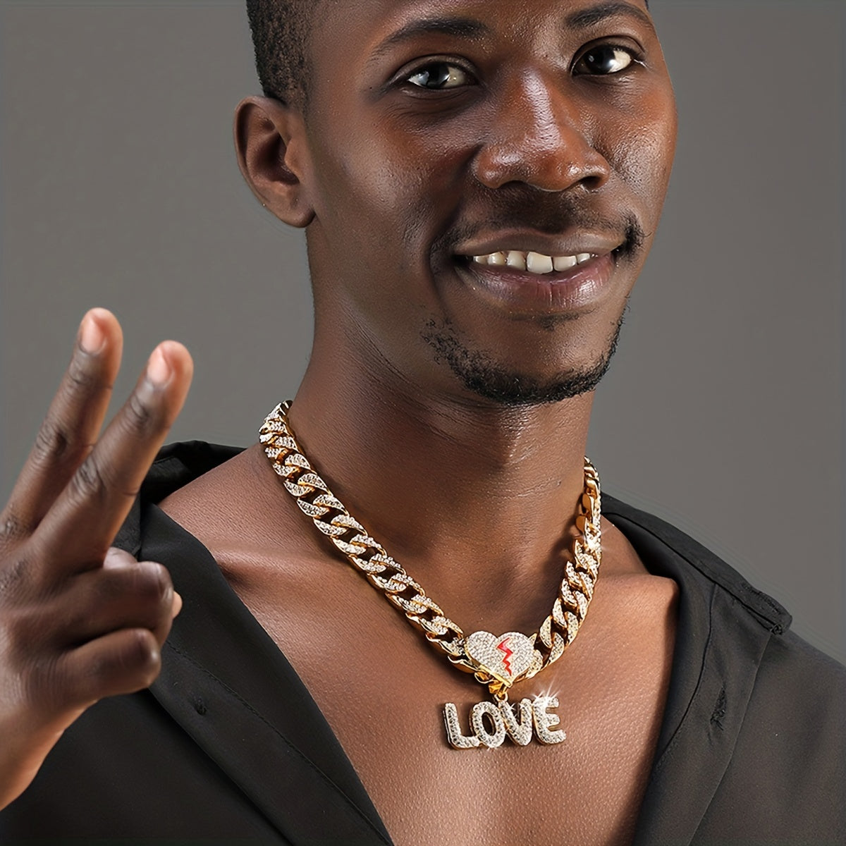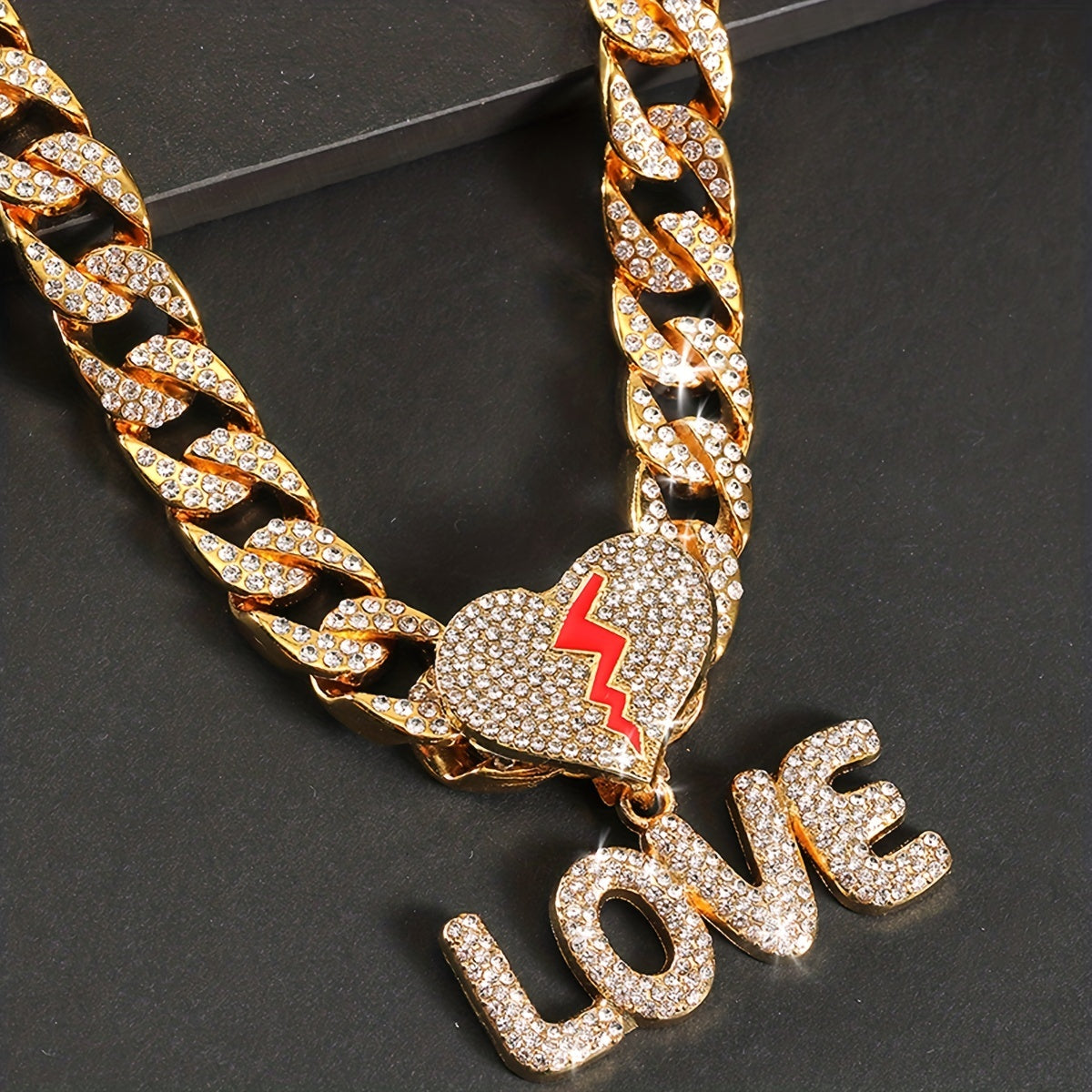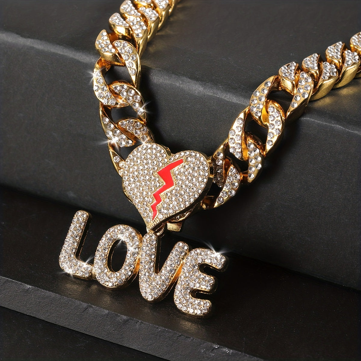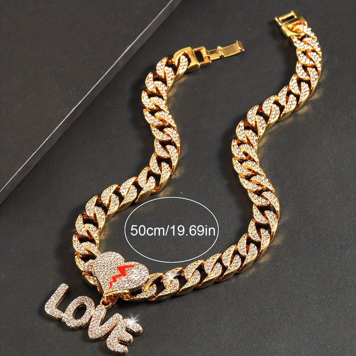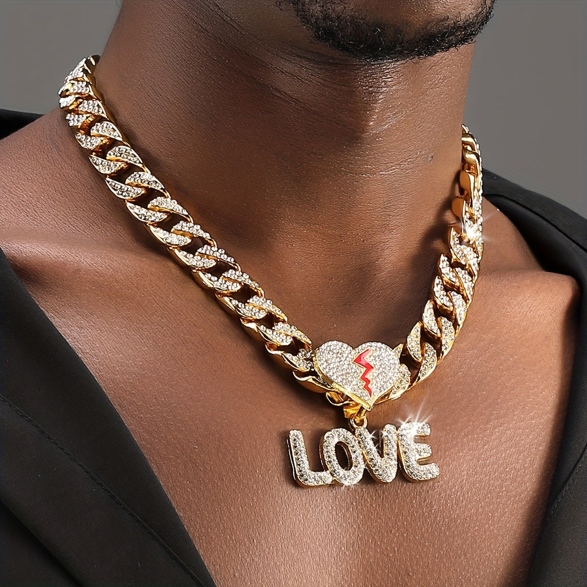 This stylish pendant necklace features a plated bling rhinestone letter LOVE on a 14MM wide Cuban chain. Perfect for both men and women.