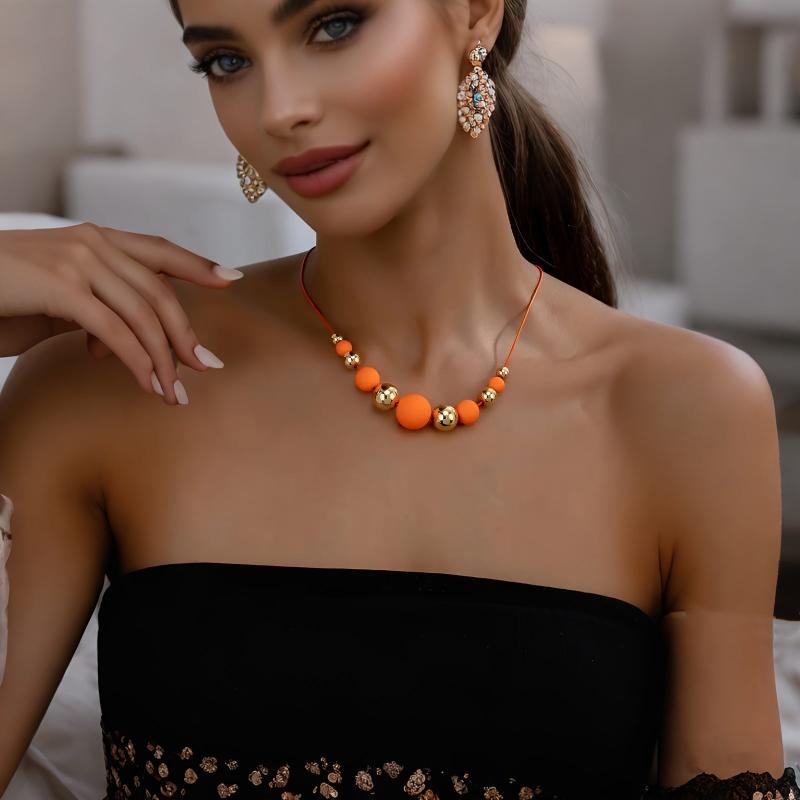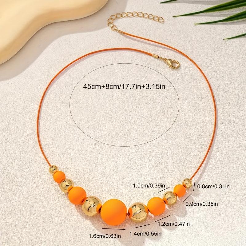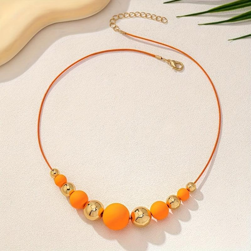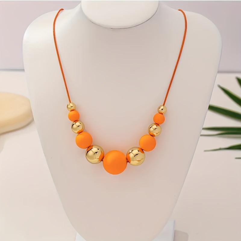 This vibrant necklace features a mix of orange and golden acrylic beads. It is lightweight and perfect for casual attire all year round. A great gift idea!
