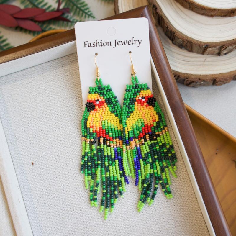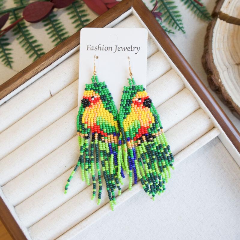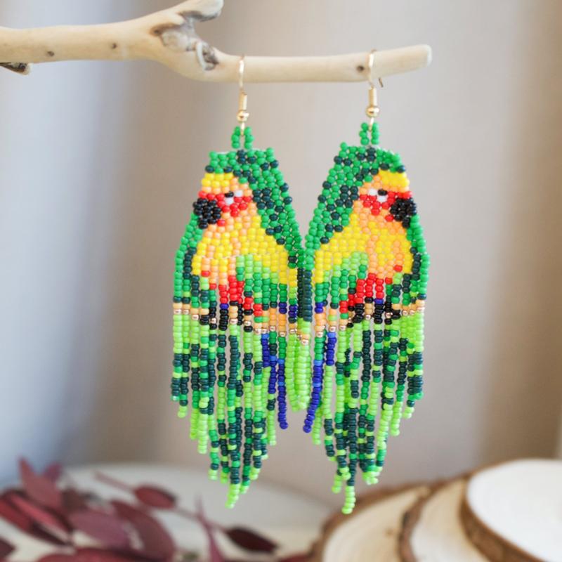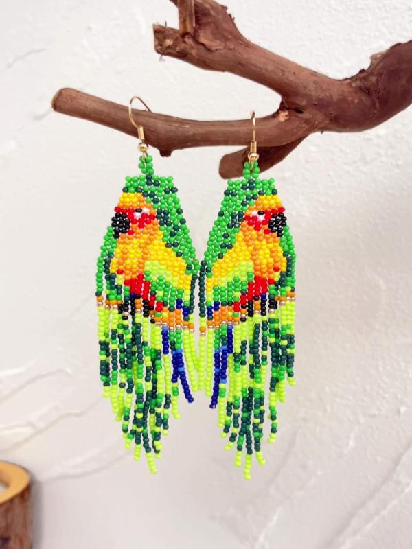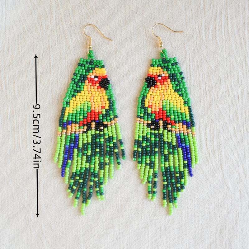 These handcrafted earrings feature beaded parrot design in a bohemian style. Made with copper earwires, they are suitable for daily wear.