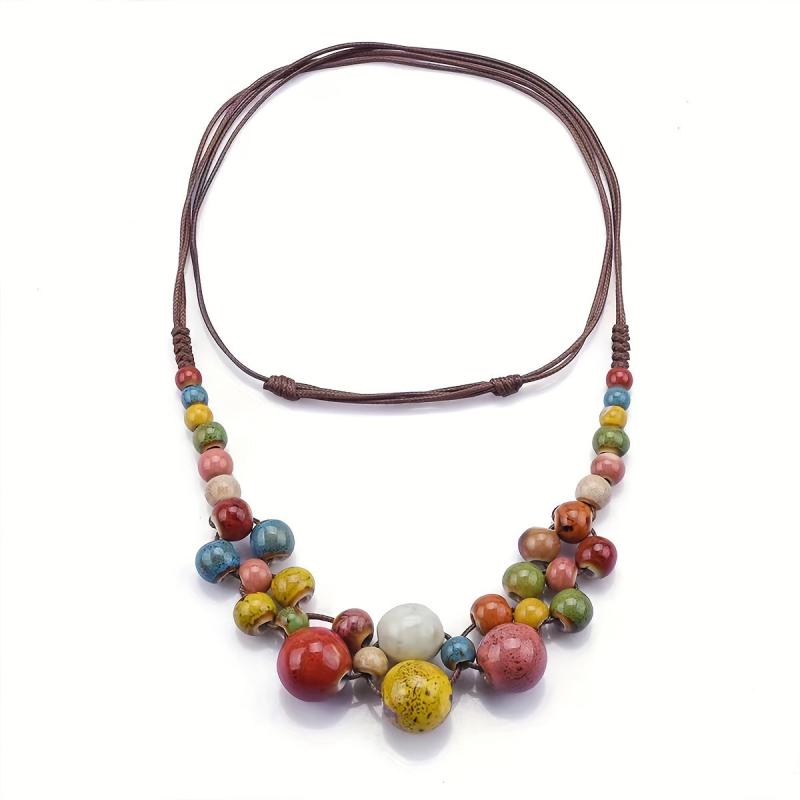 Add a touch of boho chic to your outfit with this lightweight ceramic bead necklace featuring earthy tones and pastel colors. Perfect for casual attire and makes a great gift for her.