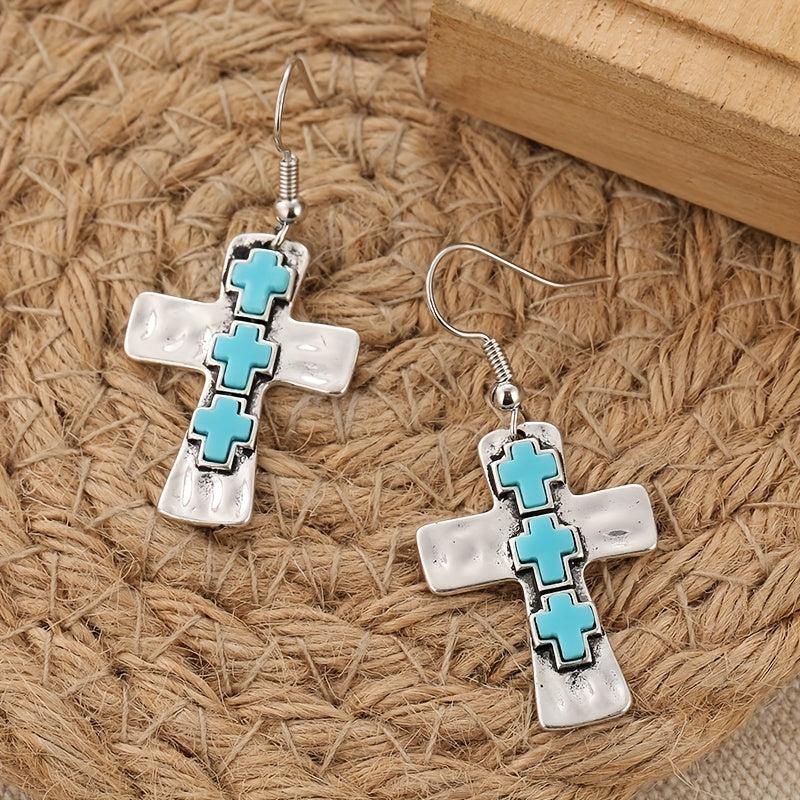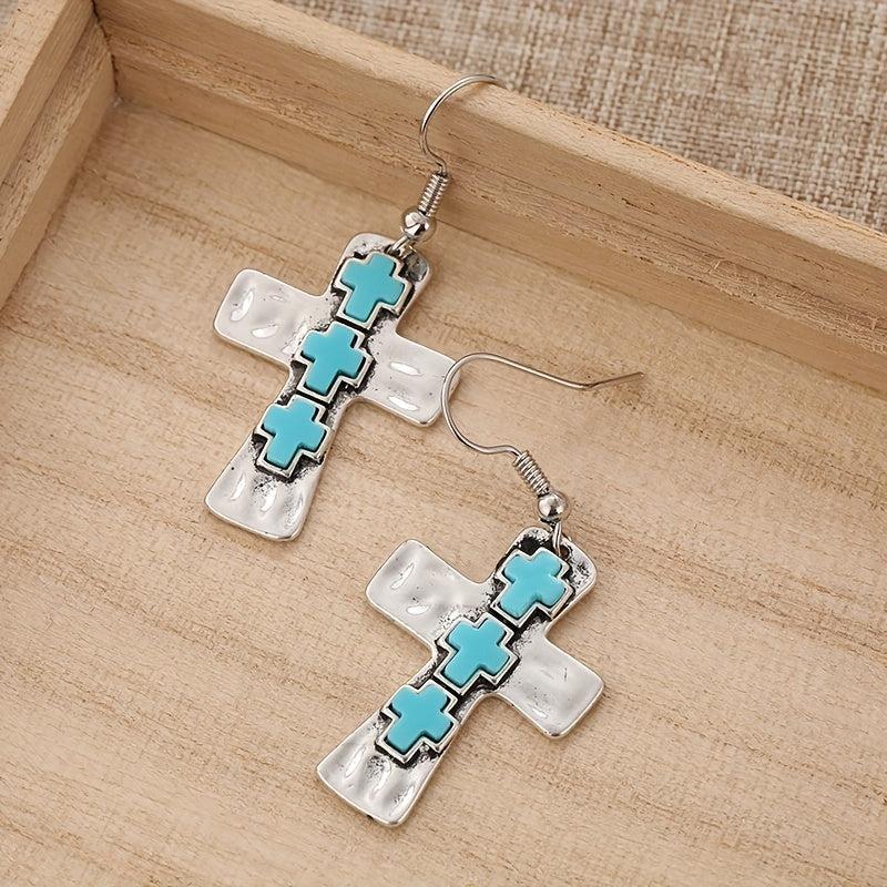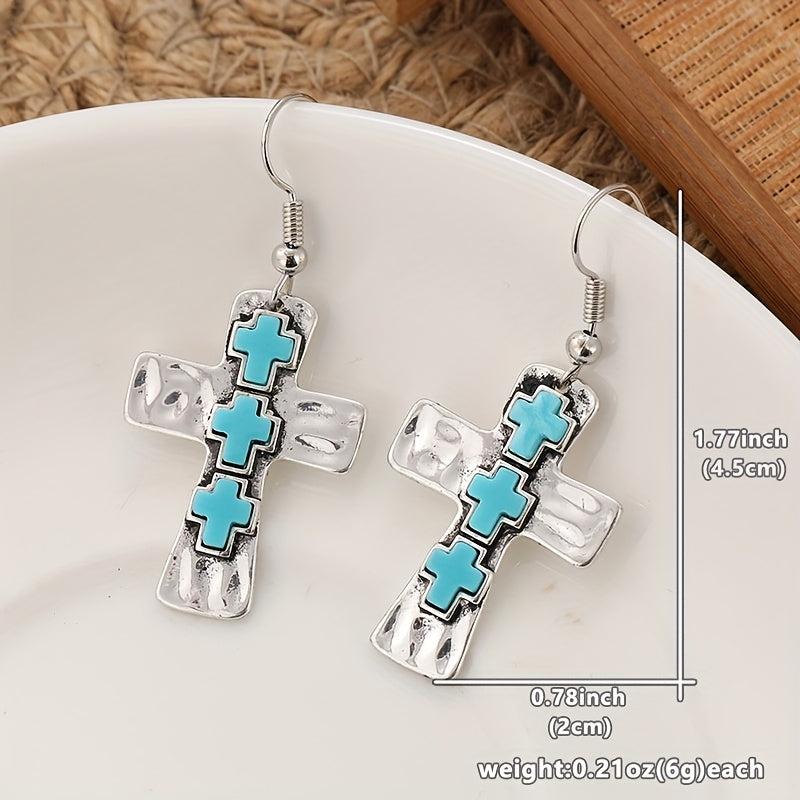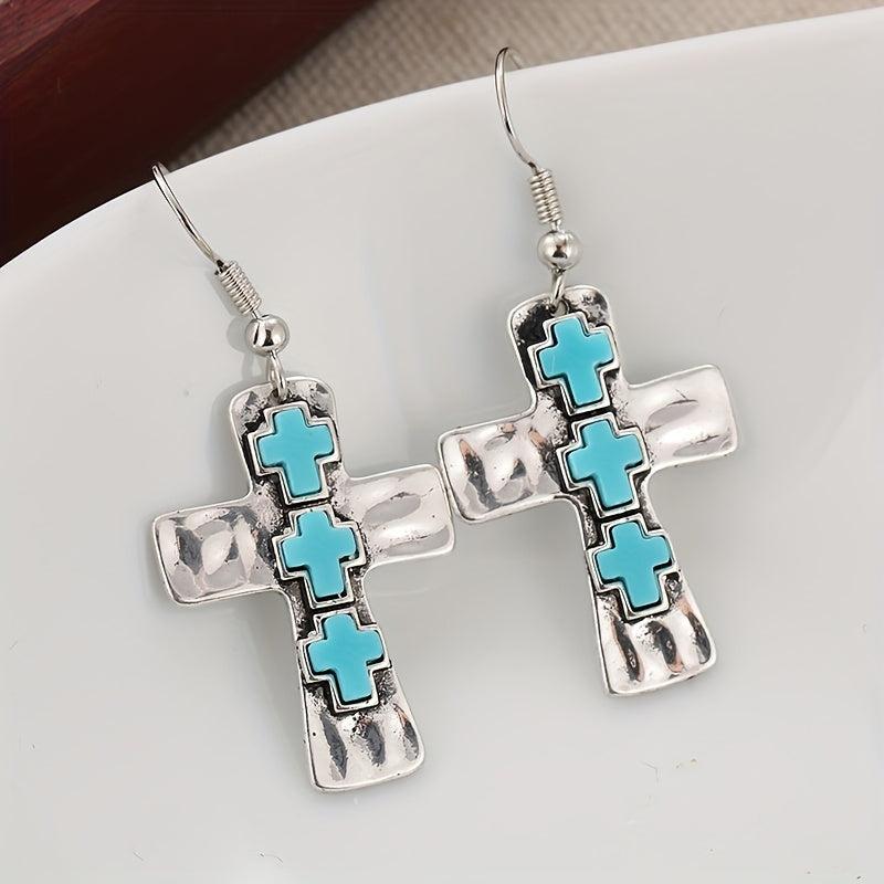 Vintage style statement earrings featuring synthetic turquoise accents. Perfect for parties and holidays.