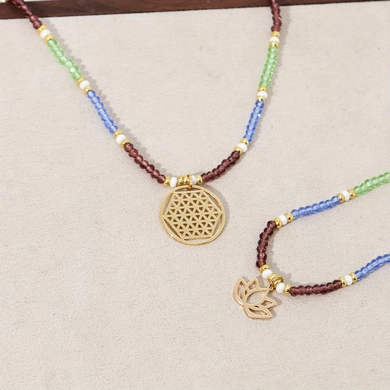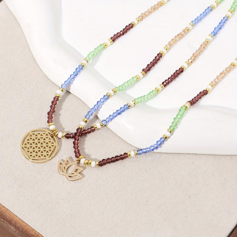 Elevate your style with these double layer lotus pendant necklaces featuring bohemian crystal beads. Perfect for any occasion and season.
