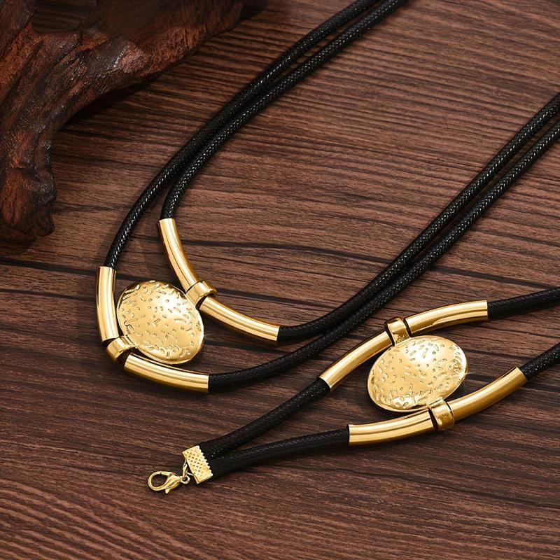 Add a touch of bohemian style to your look with this fashionable two-piece set featuring a double layer cord necklace and matching bracelet.