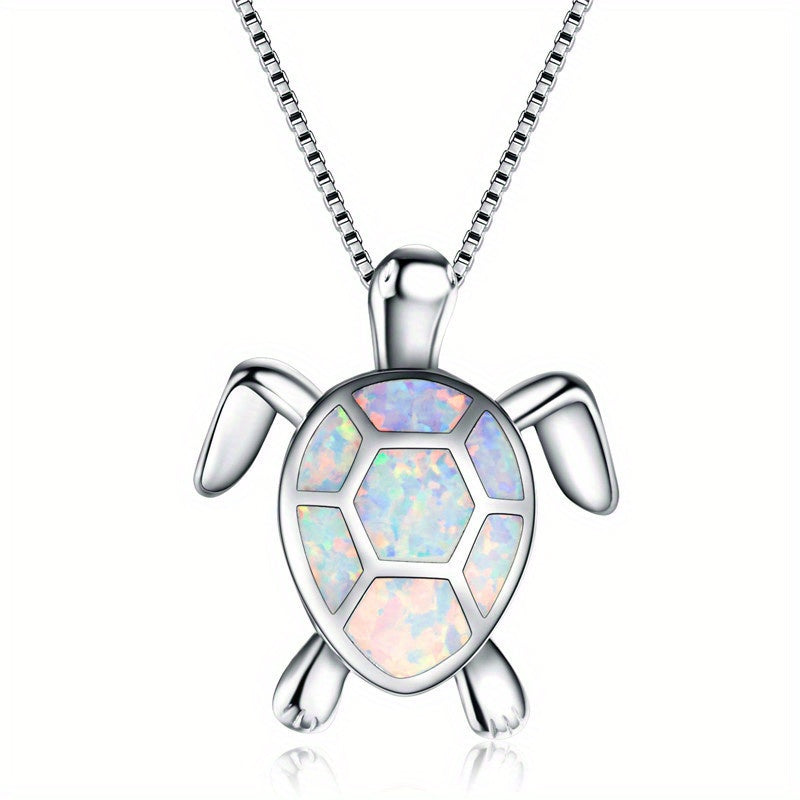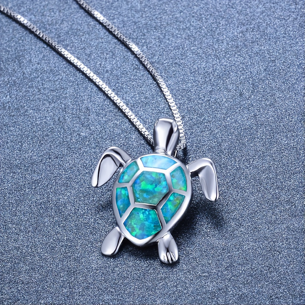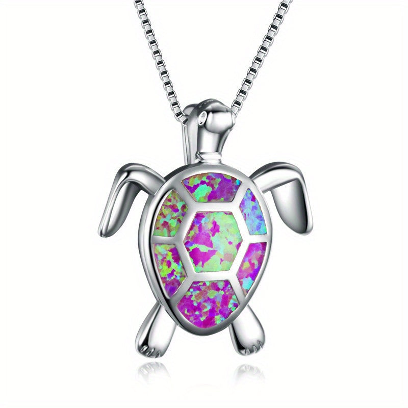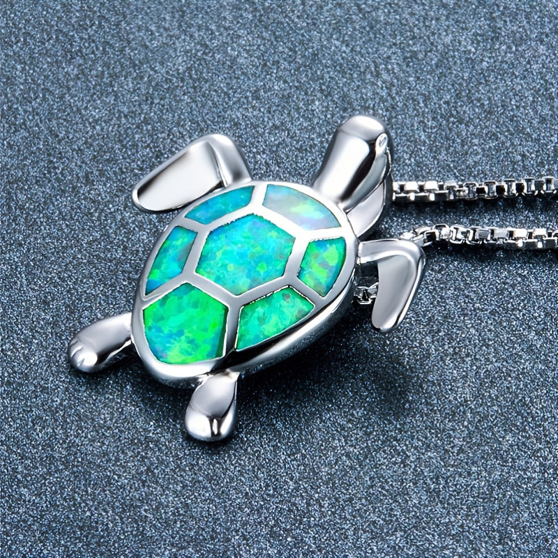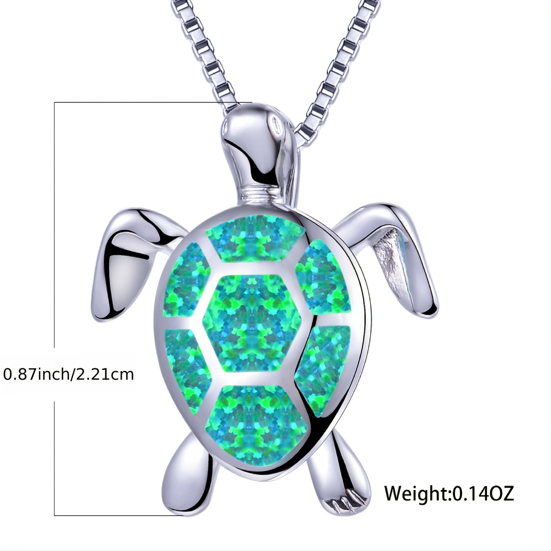 Add a touch of bohemian charm to your outfit with this stunning fire opal necklace featuring large tortoise pendants. The vibrant green opal stones and silver chain create a unique and eye-catching accessory.