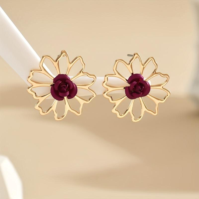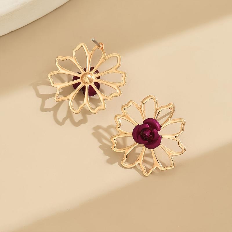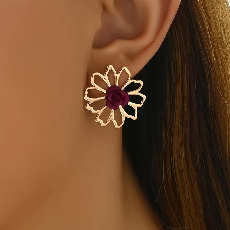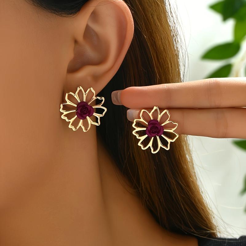 Elevate your style with these exquisite Bohemian floral hollow stud earrings. Crafted with vibrant purple and pink centers and a golden tone finish, they are perfect for daily wear, parties, and vacations.