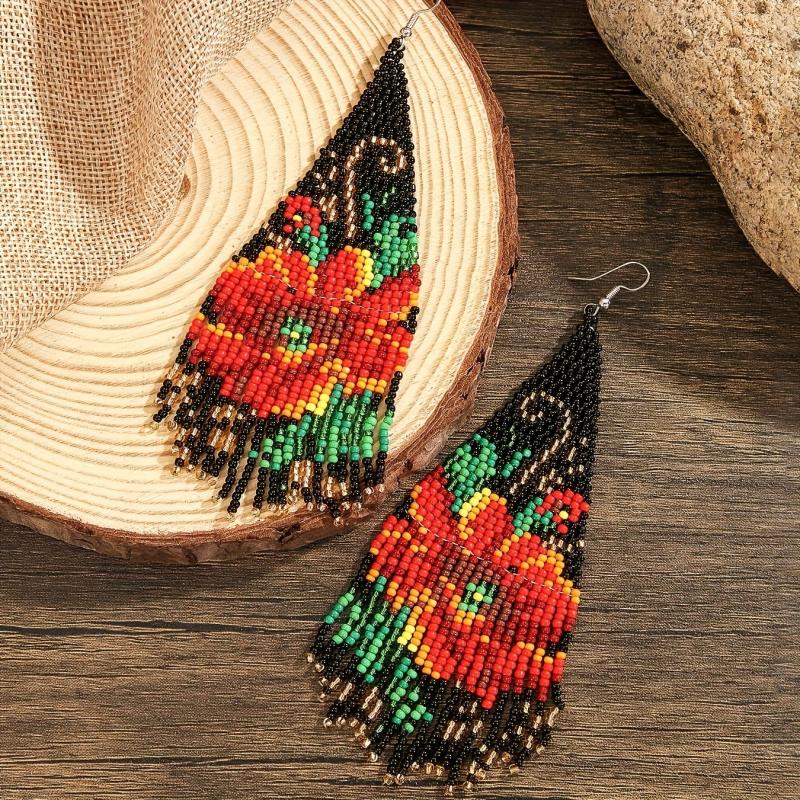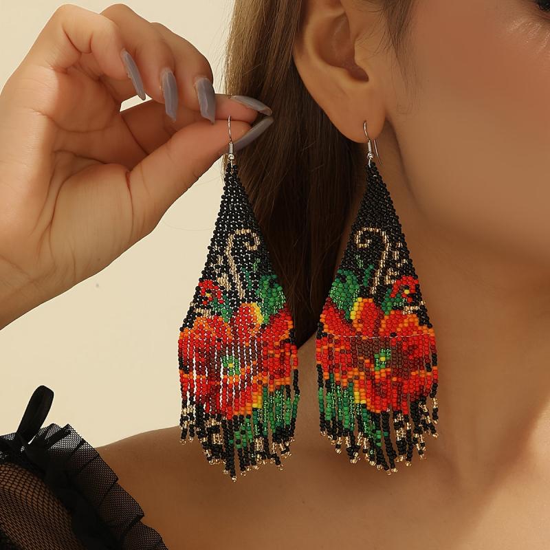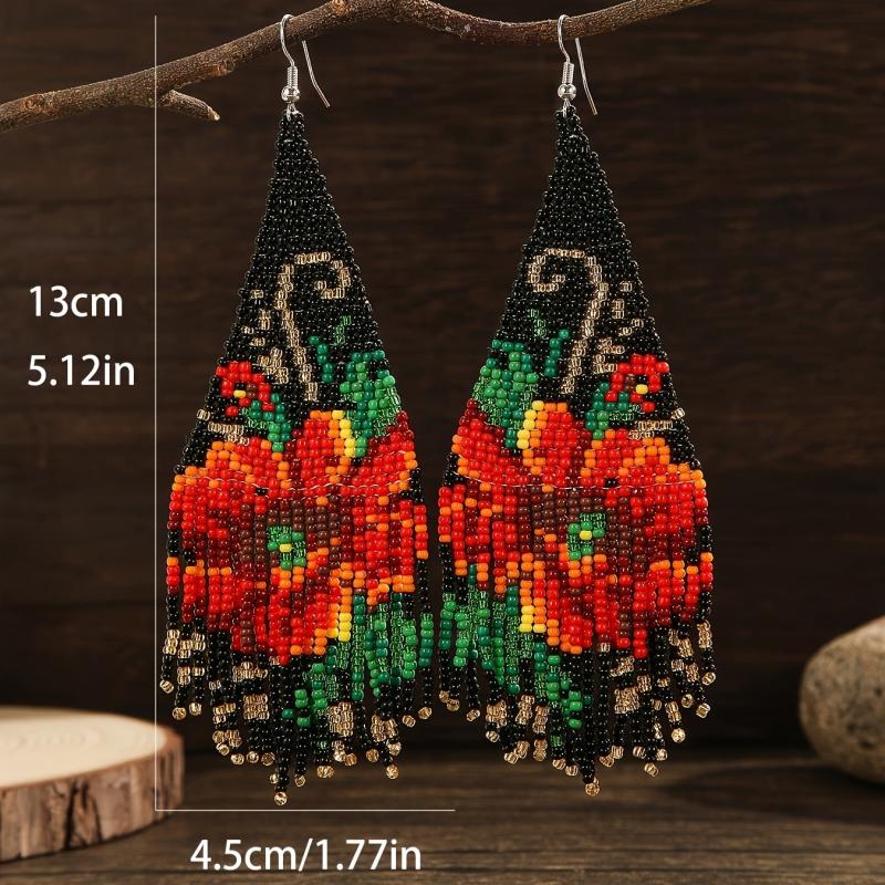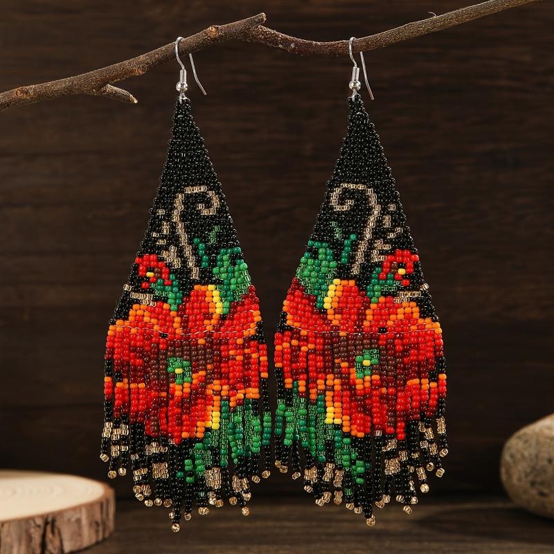 Add a touch of vintage charm with these handwoven floral tassel earrings, featuring glass rice beads. Perfect for a bohemian look.
