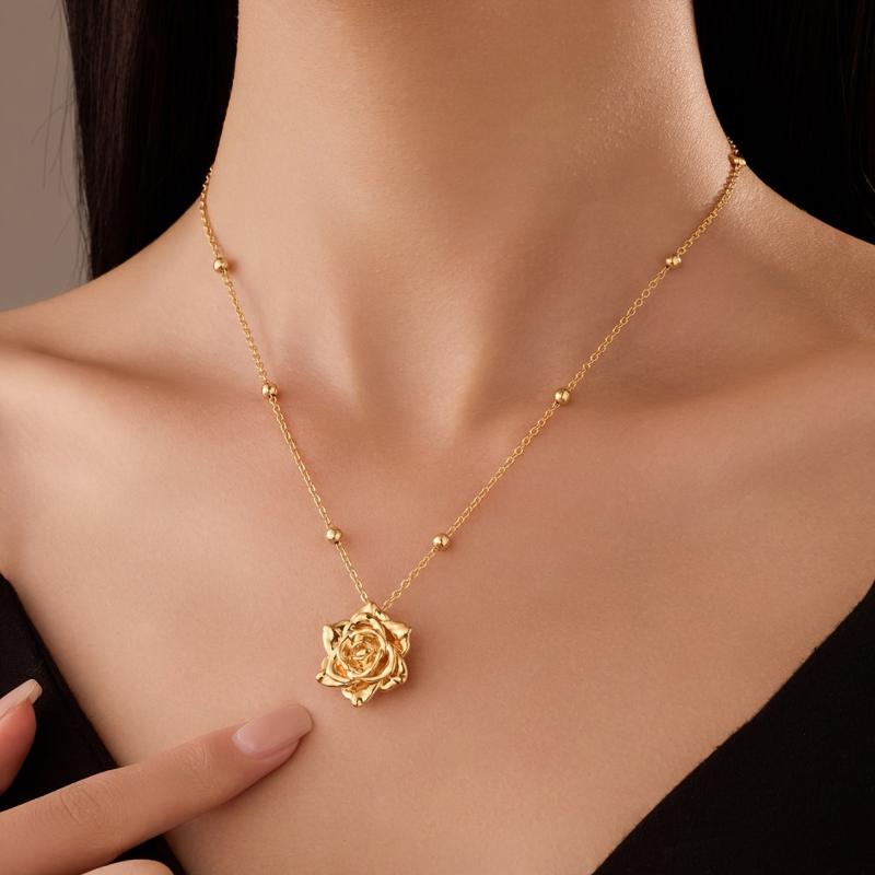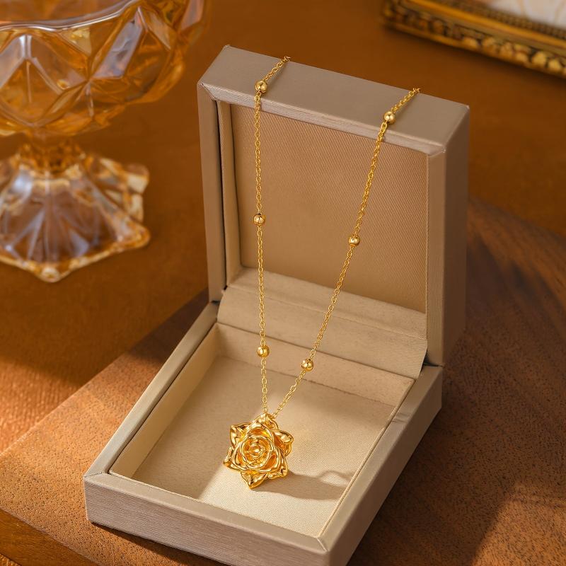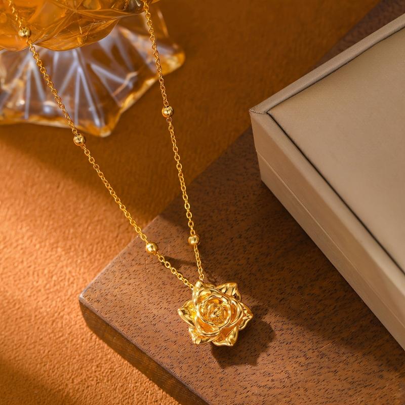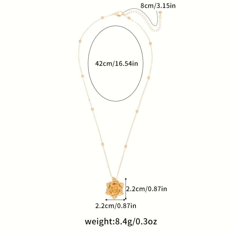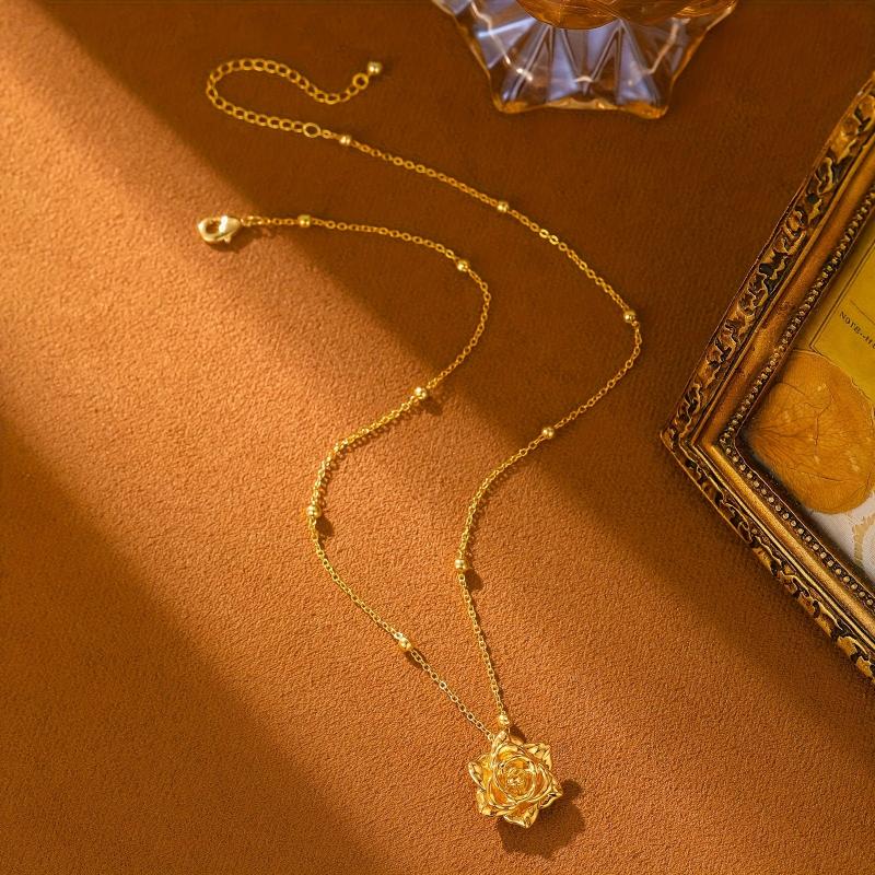 This necklace features a sophisticated French rose pendant design in golden tone copper, perfect for both casual attire and special occasions. It makes an ideal gift charm necklace for any occasion.