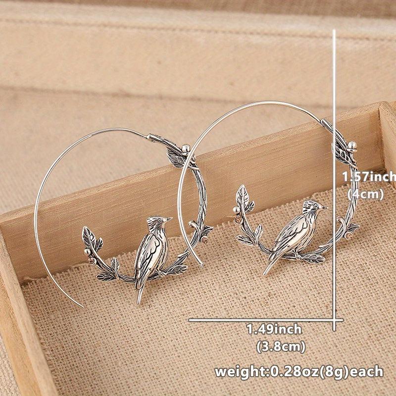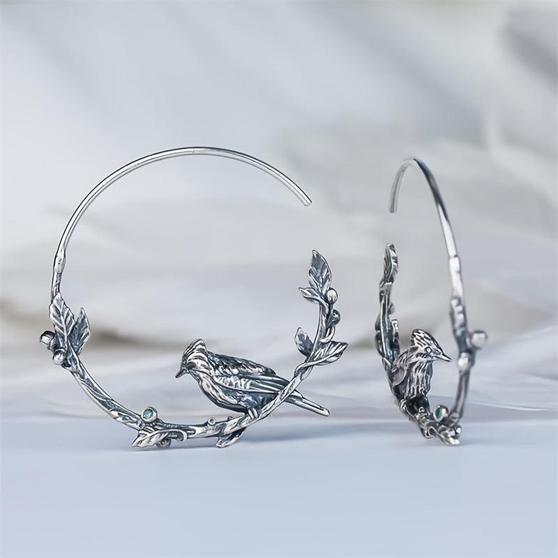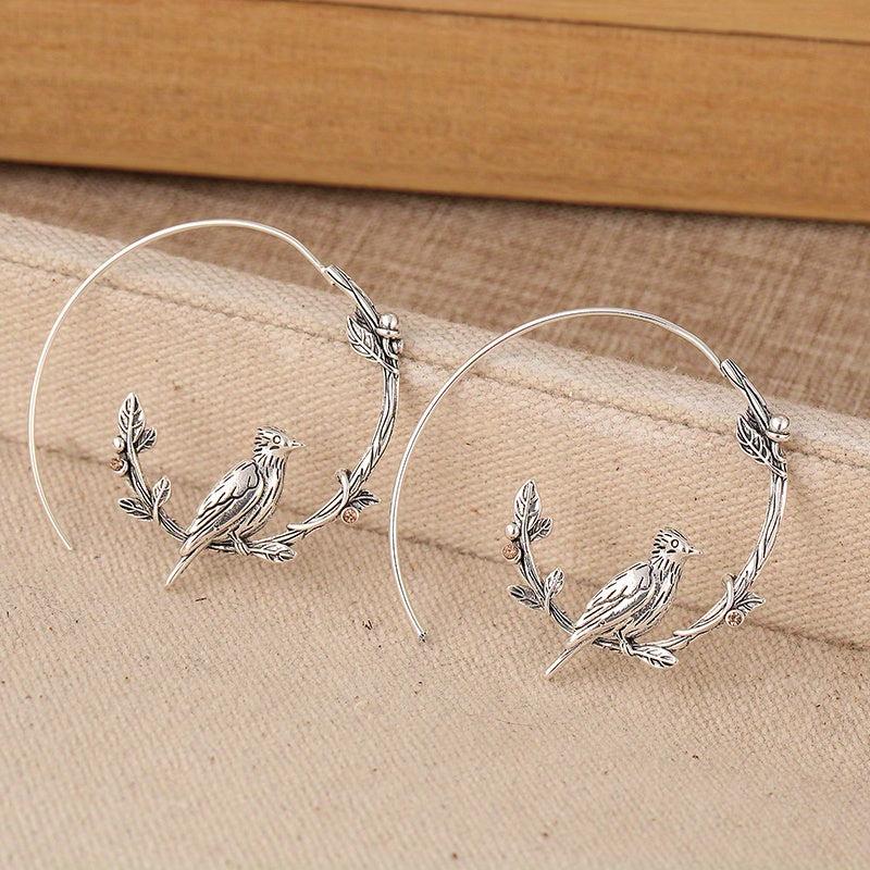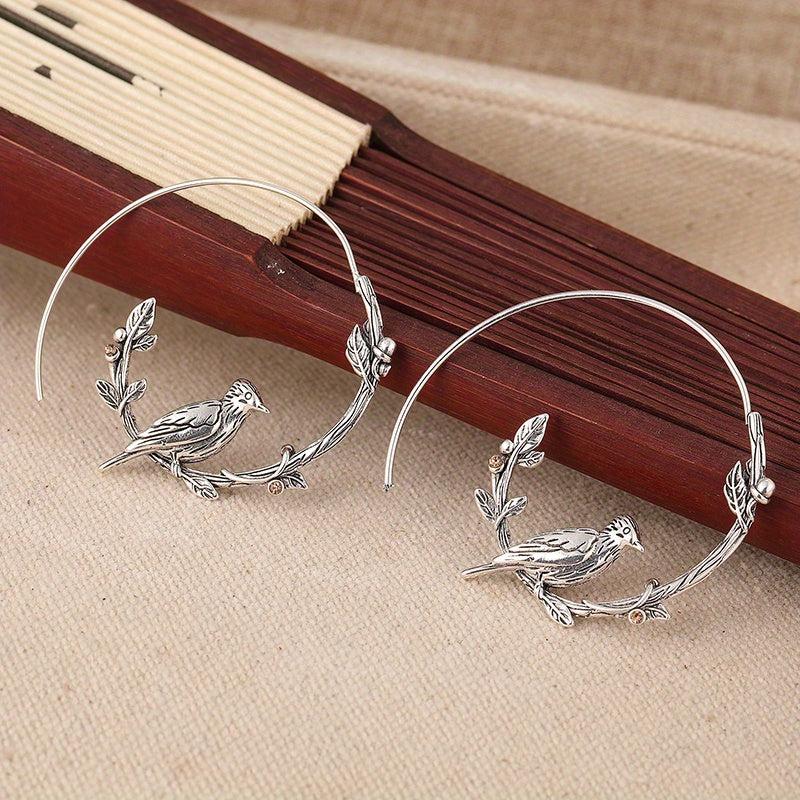 These retro Bohemian earrings feature intricate branch design with bird and floral motifs. Made of copper with cubic zirconia accents, these earrings are perfect for everyday wear.