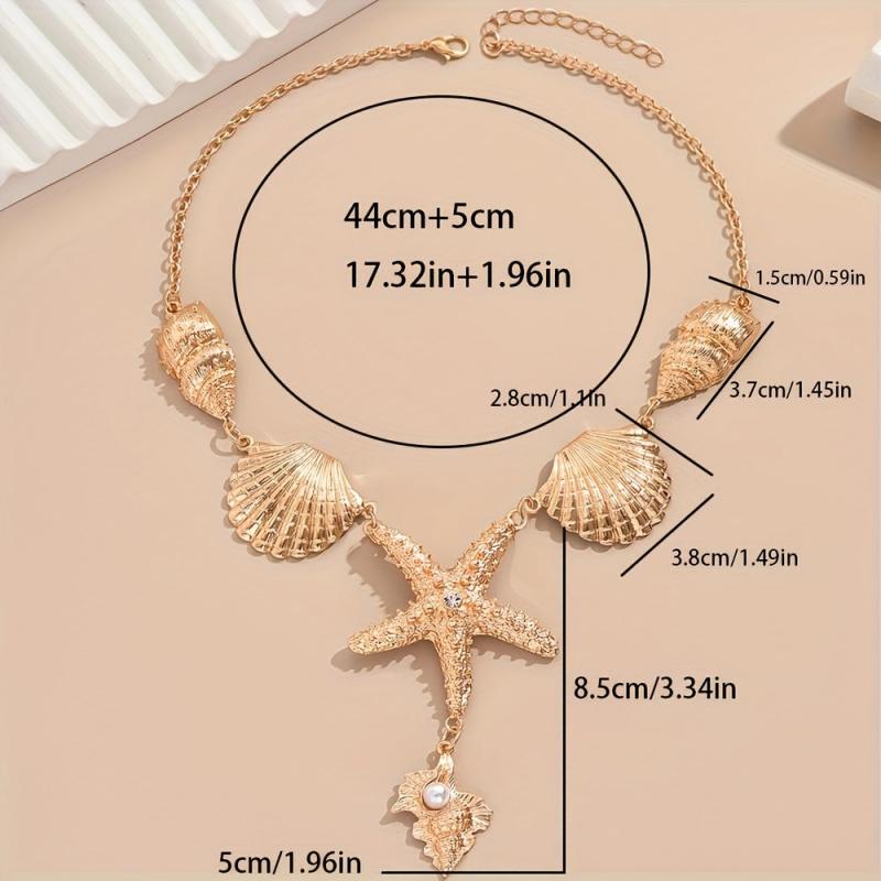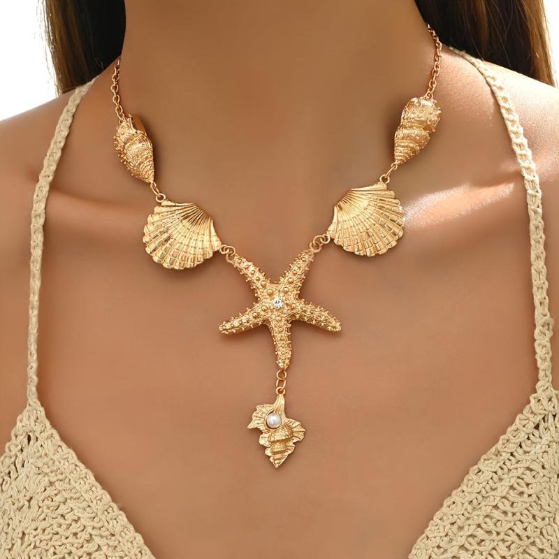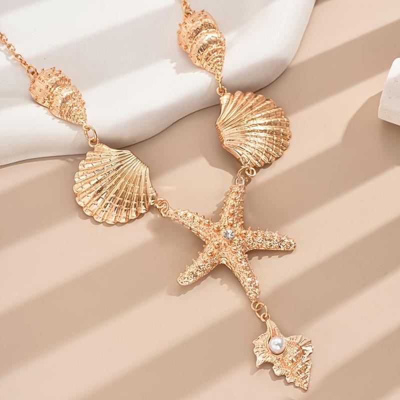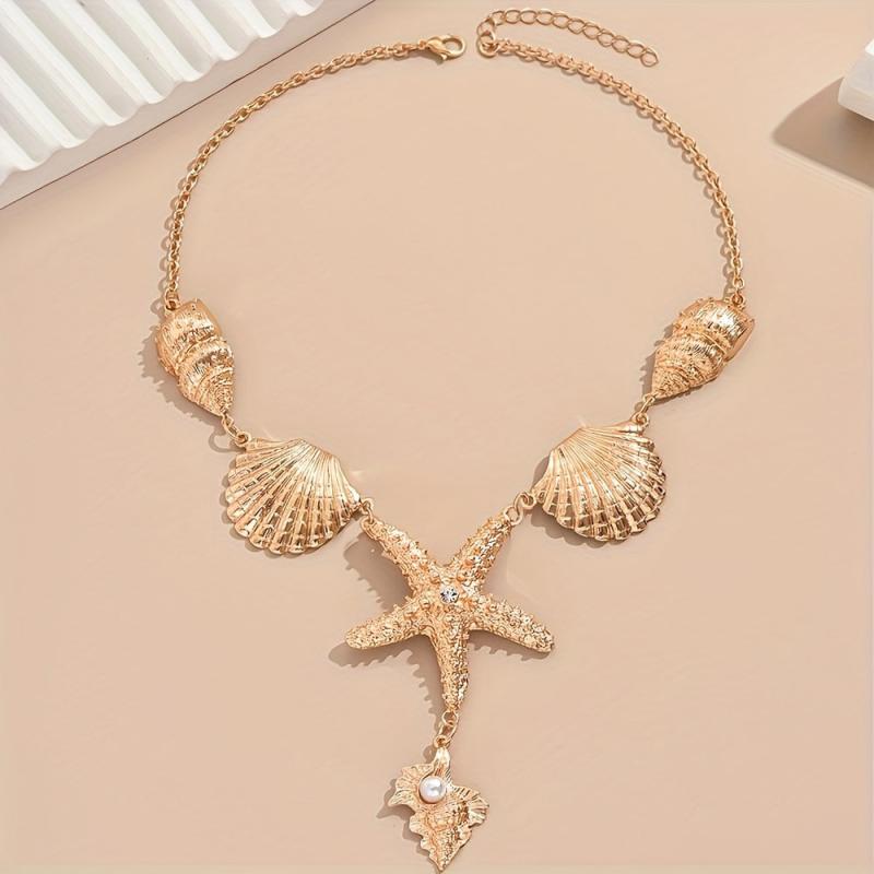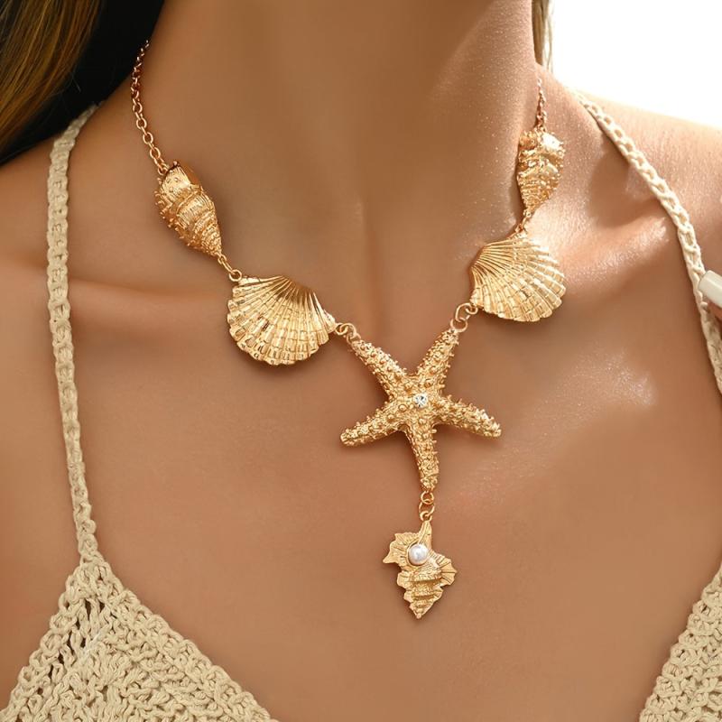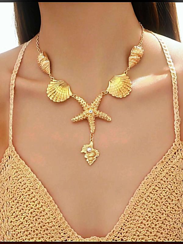 Add a touch of beachy bohemian flair to your outfit with this metal pendant necklace featuring a fan, starfish, and conch design. Perfect for ocean vacations and casual summer looks.