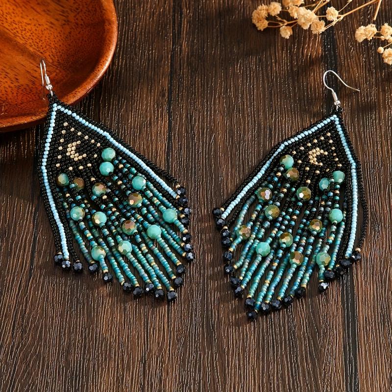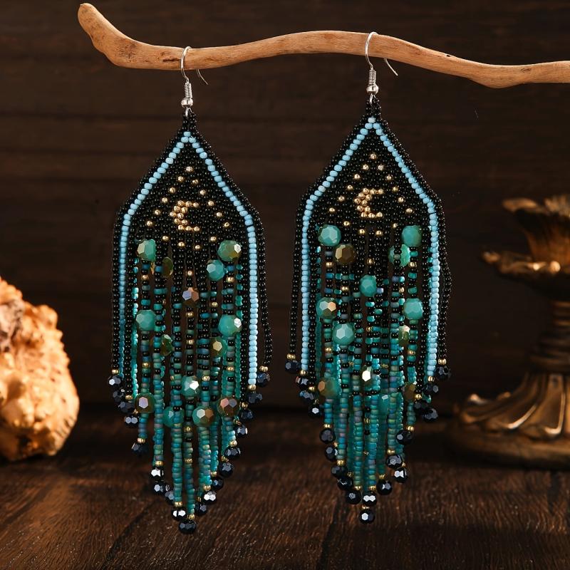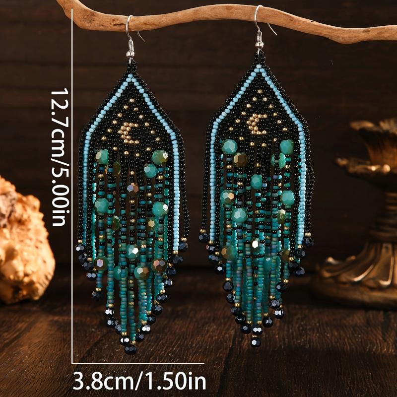 Elevate your casual attire with this pair of women's tassel earrings featuring a bohemian starry moon pattern. Hand-woven with artificial glass rice beads, these earrings are perfect for adding a touch of sophistication to your outfit.