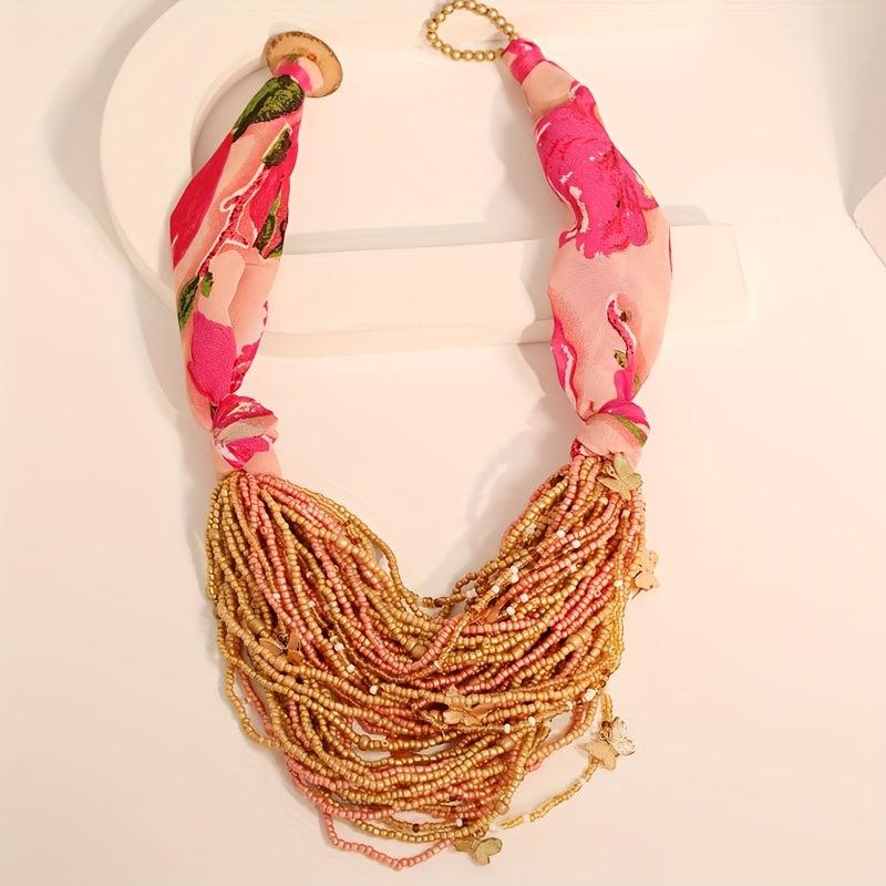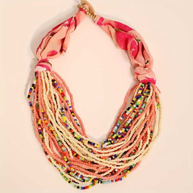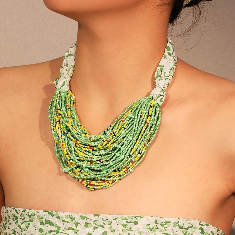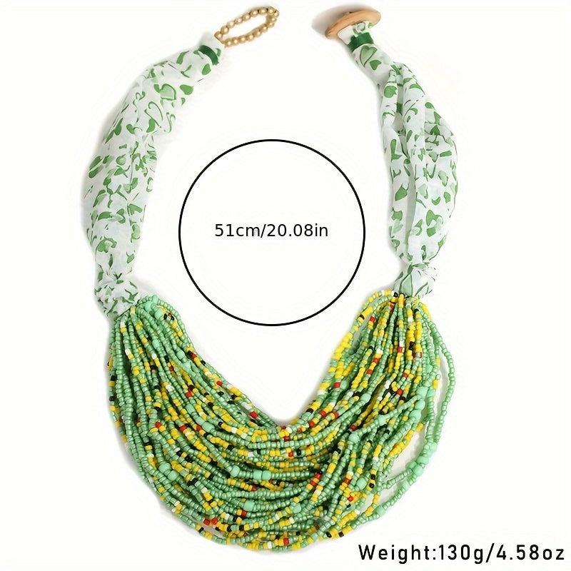 Add a pop of color to your outfit with this handwoven multicolor beaded necklace. The textured beads in green and yellow hues create a vibrant and unique accessory.