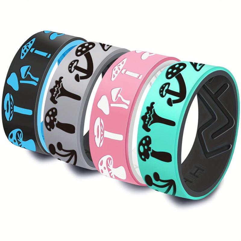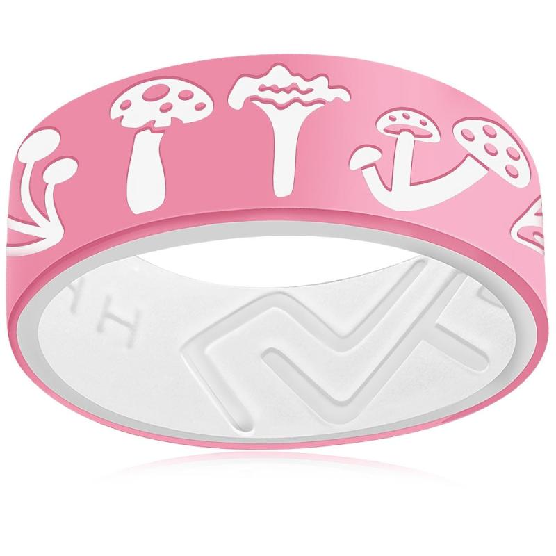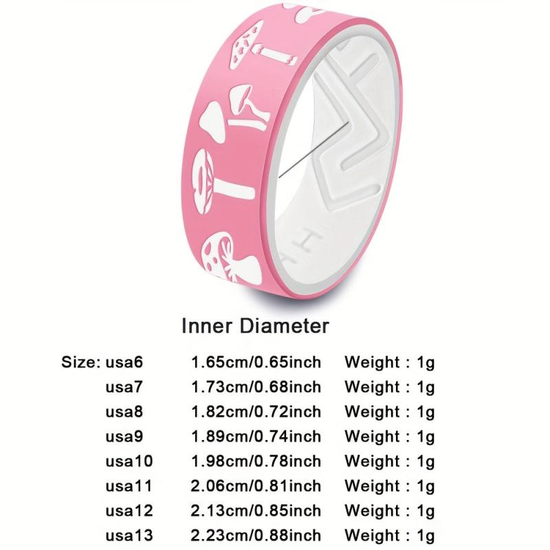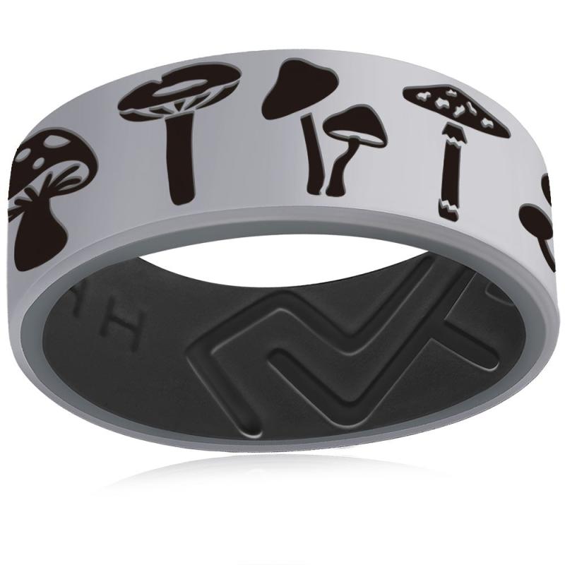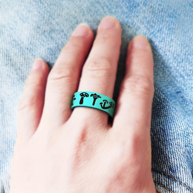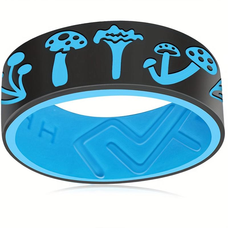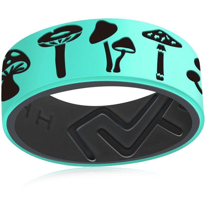 This Bohemian Mushroom Silicone Carving Ring features a turquoise design with Mushroom & Forest elements. It is 8mm wide and offers comfort and breathability, making it perfect for outdoor activities.
