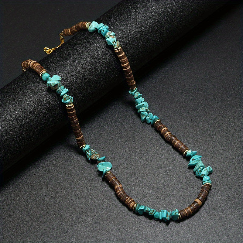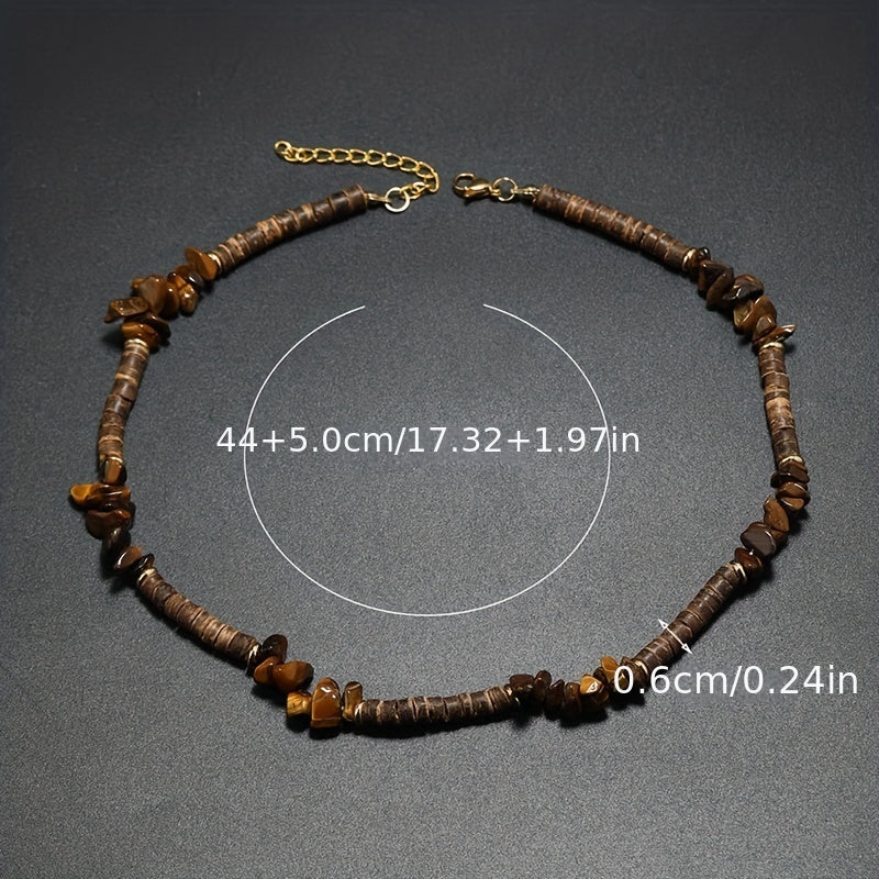 This bohemian necklace features pine stone, crushed stone, and coconut shell. Perfect for male surfing punk style.