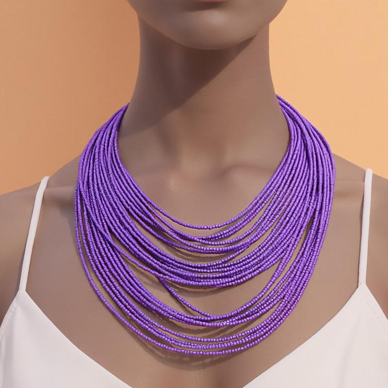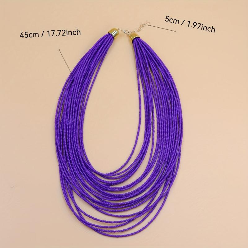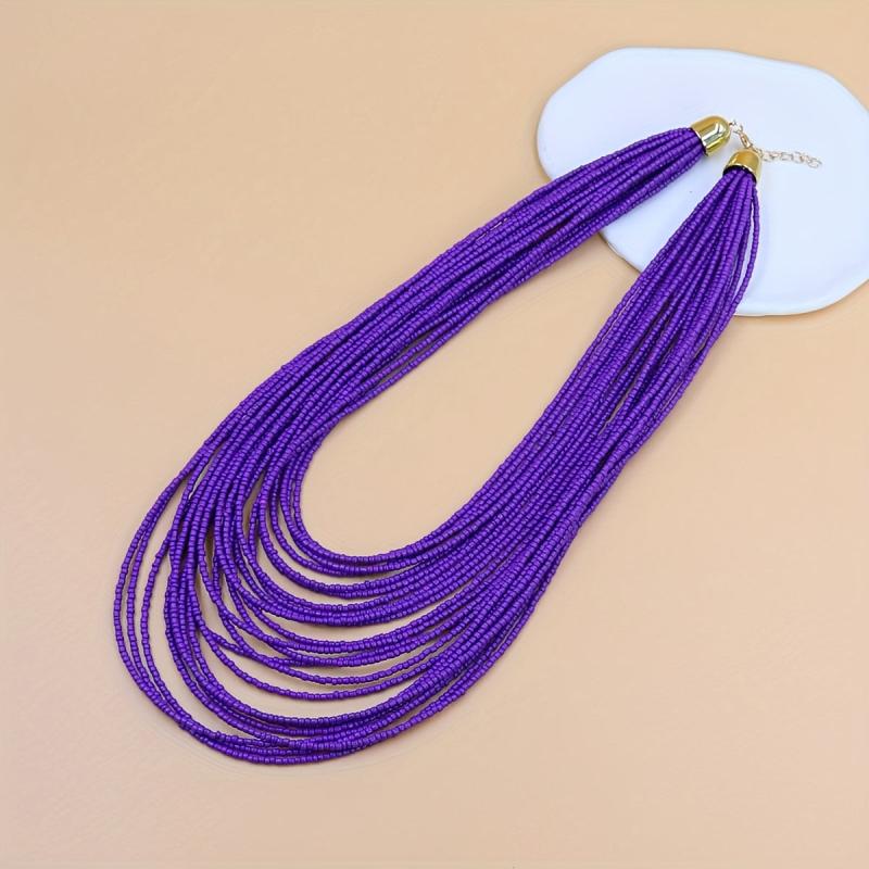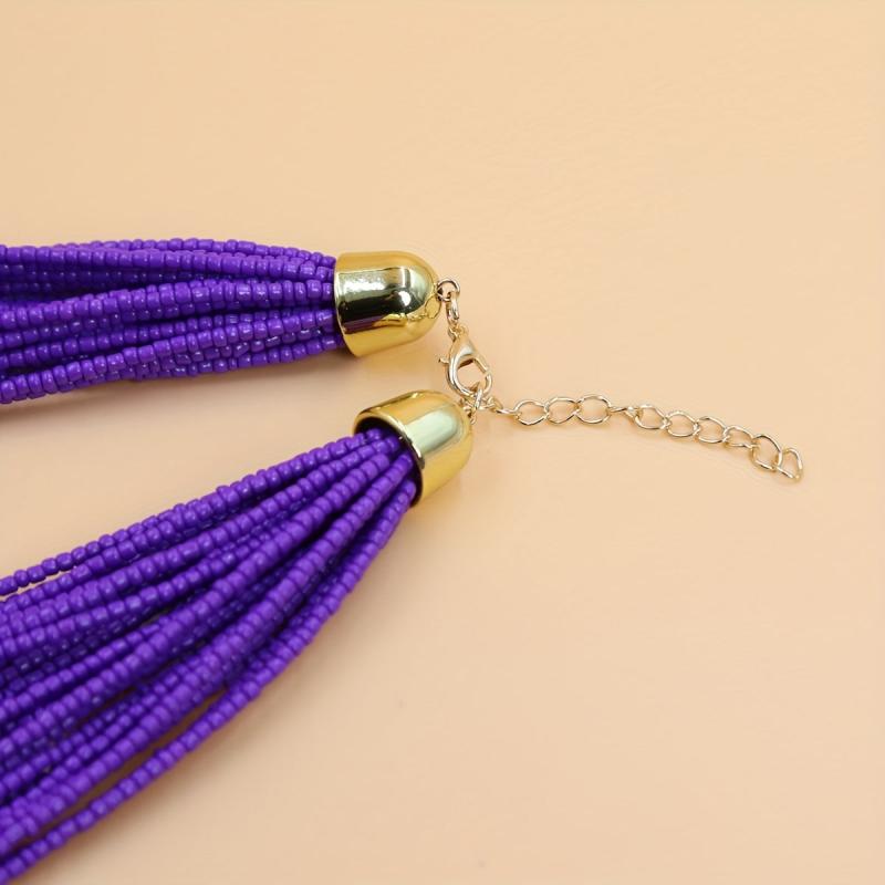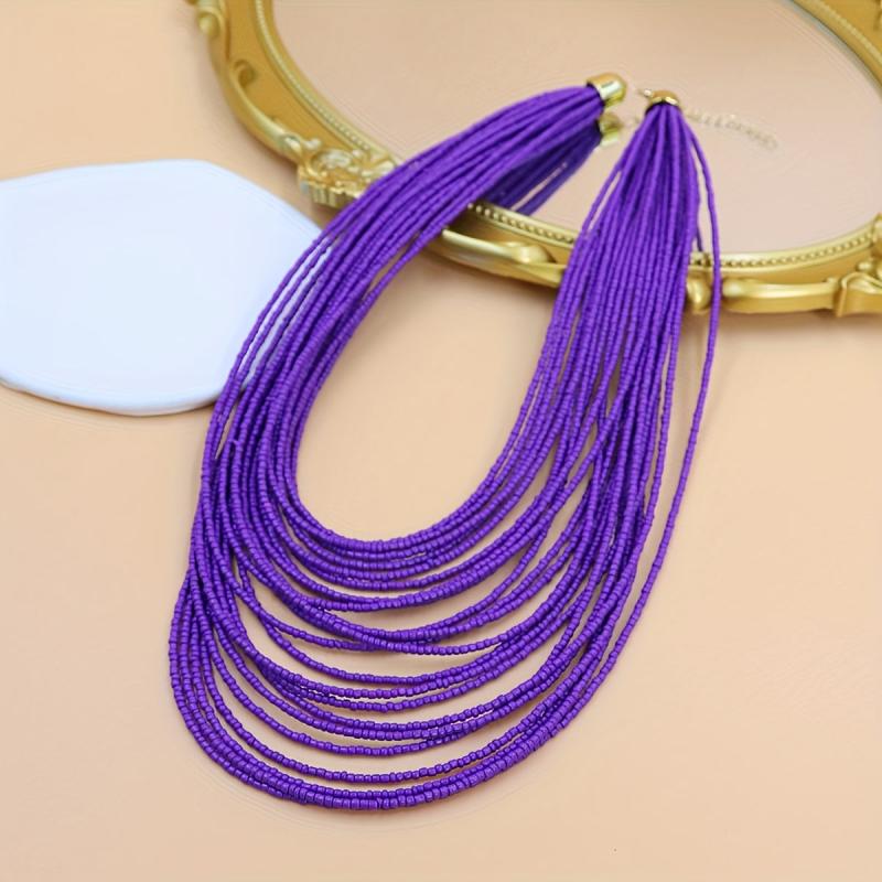 This Bohemian vintage necklace features intricate purple beads in a braided design with a natural finish. Perfect for spring or summer, it can be worn casually or formally. Makes a unique gift idea for women.