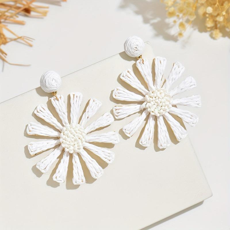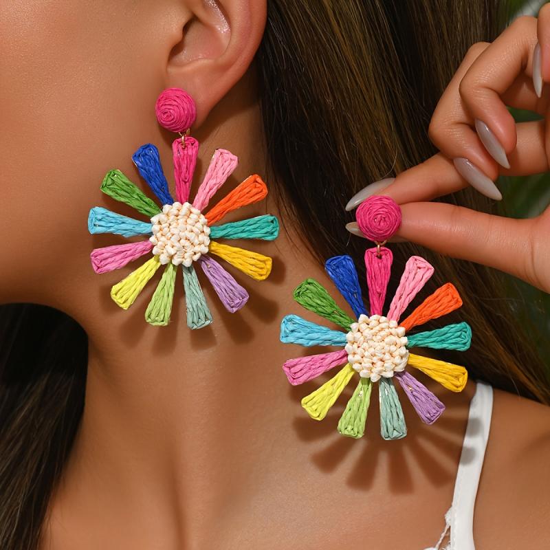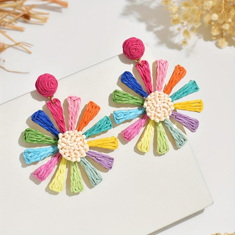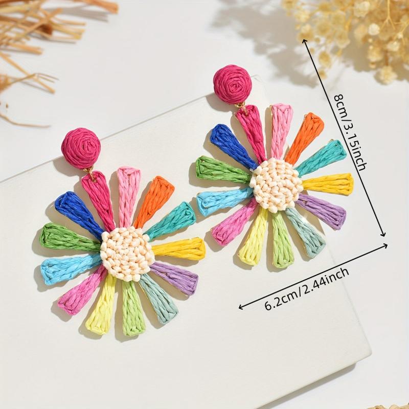 Elevate your style with these vibrant Bohemian Raffia Sunflower Dangle Earrings. Perfect for parties, vacations, and Valentine's Day, these earrings feature geometric floral patterns that add a touch of fun and elegance to your outfit.