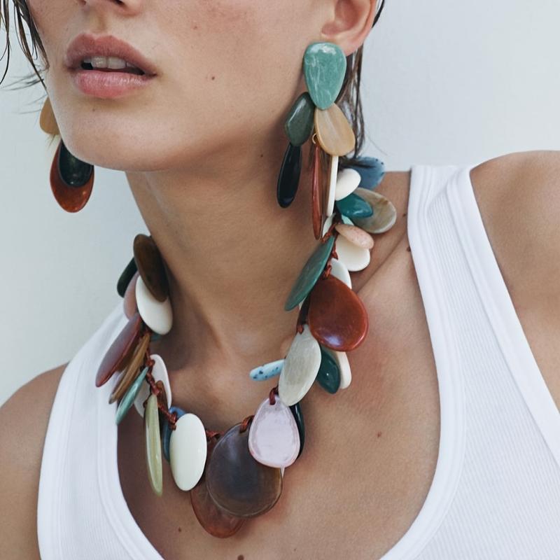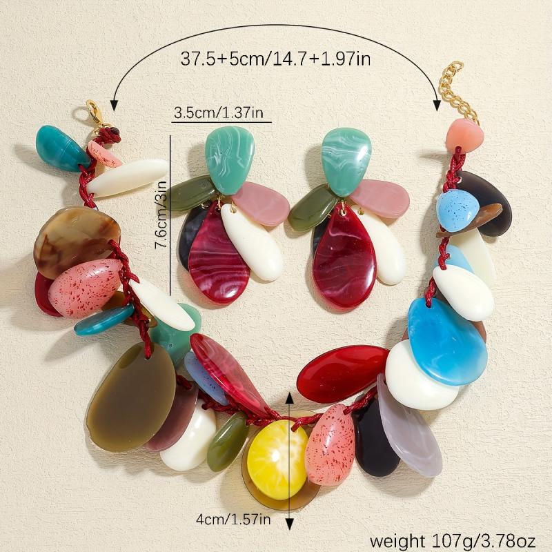 This set features unique resin slice earrings and a matching necklace handwoven on a cord. Perfect for women who love bohemian style accessories.