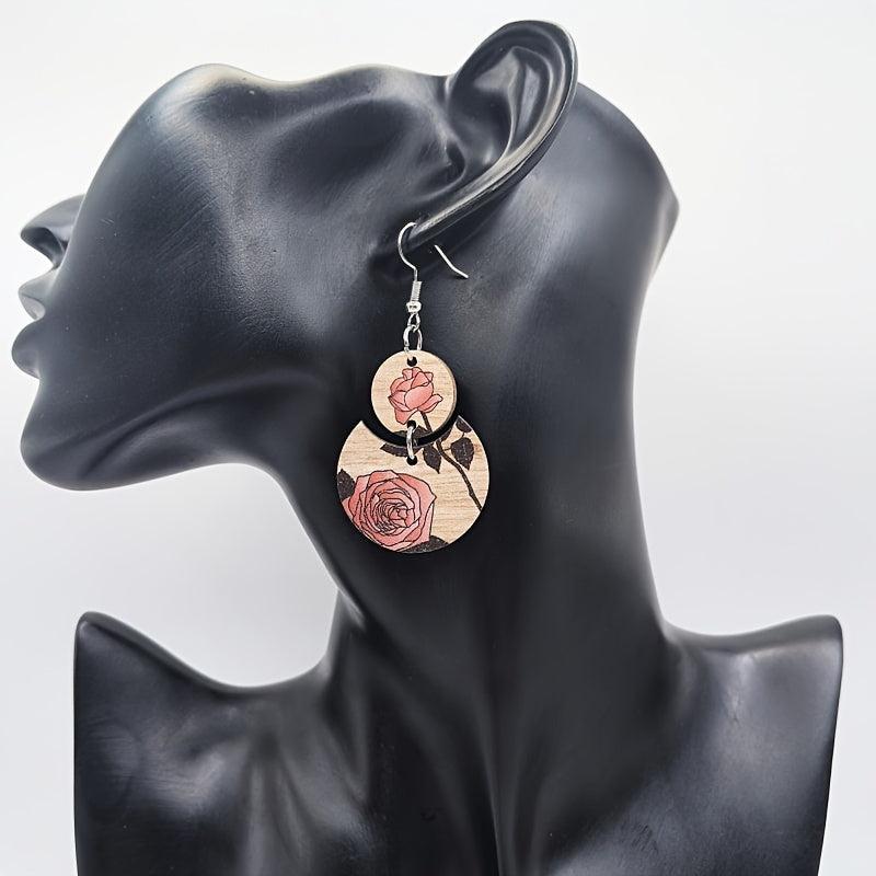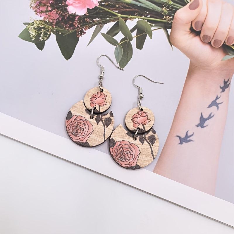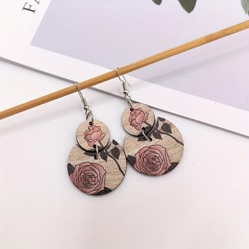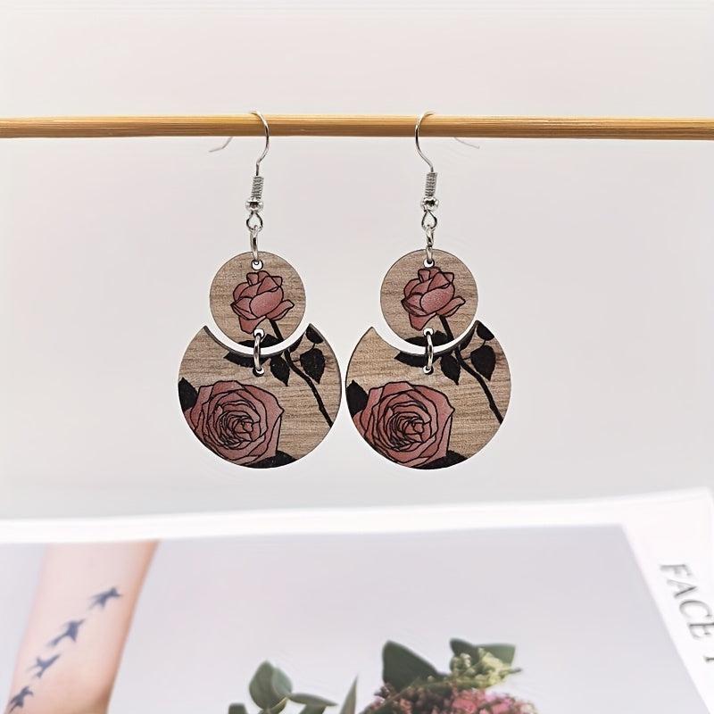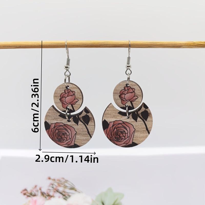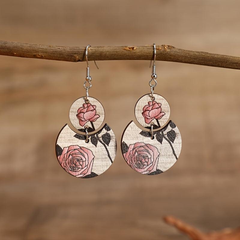 These stylish Bohemian earrings feature a retro ethnic design with a crescent shape, adorned with printed roses and wooden stitching. Perfect gift for your mother.