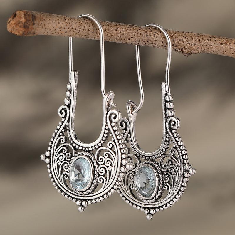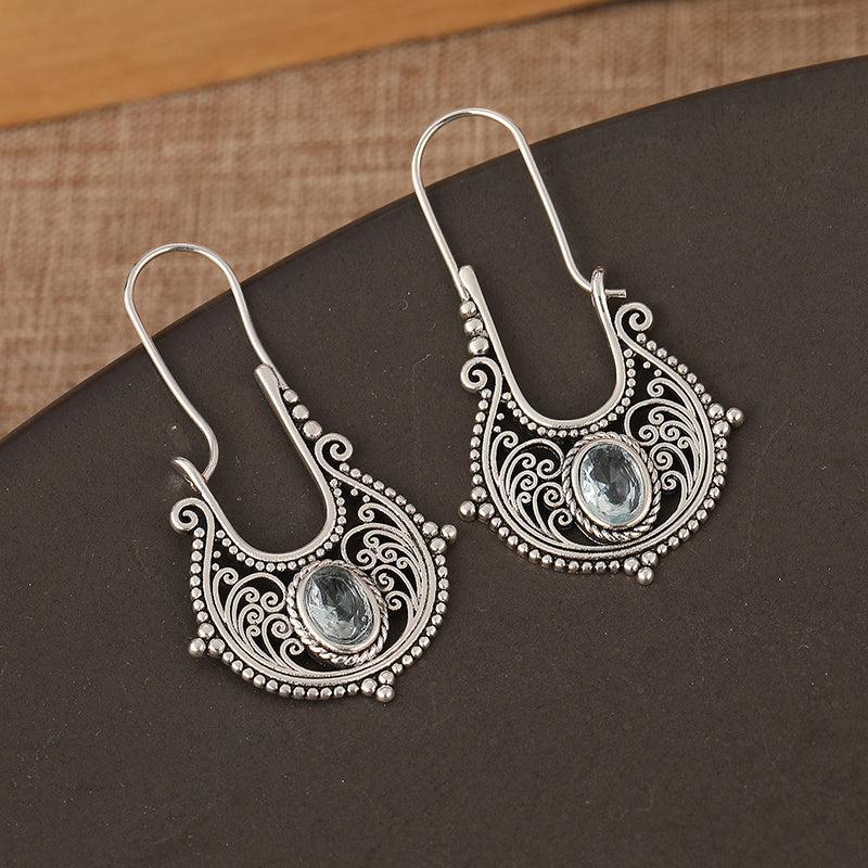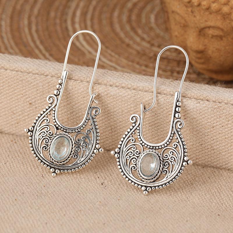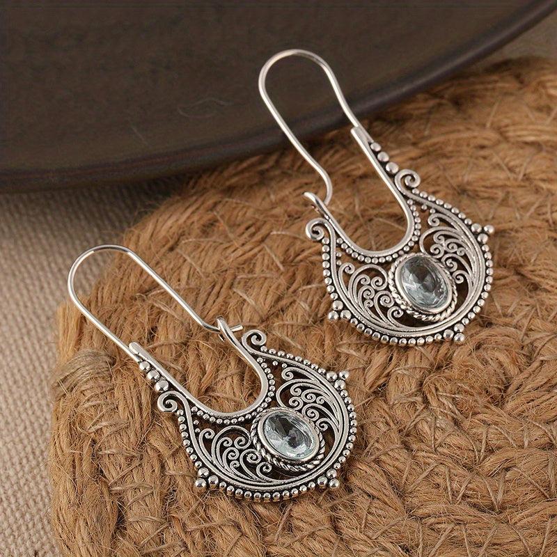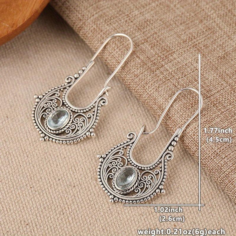 Elegant earrings for daily wear or holidays featuring intricate floral pattern and oval light synthetic crystals.