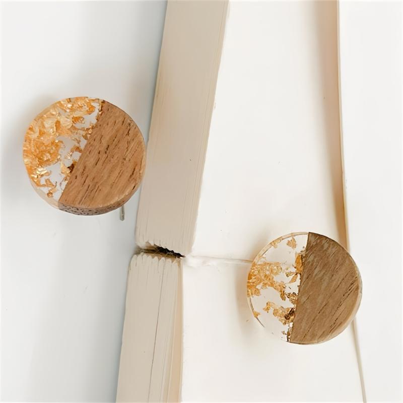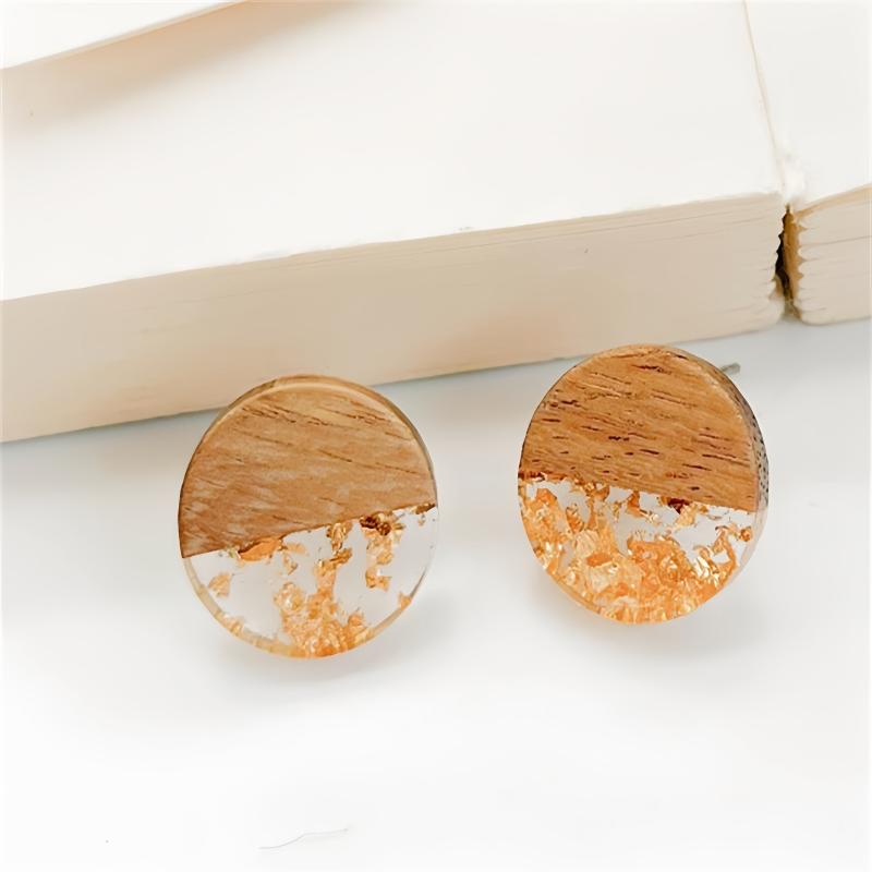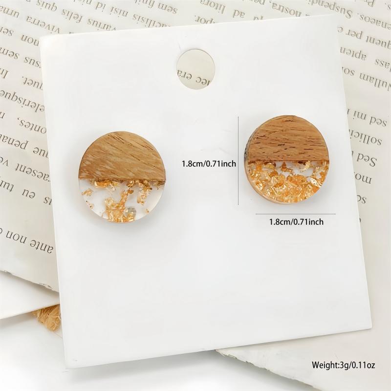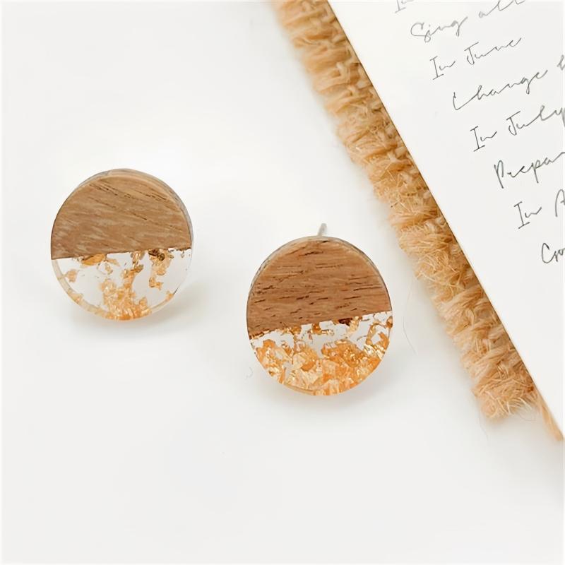 Add a touch of boho chic with these European and American-inspired round log pendants earrings featuring acrylic spliced wood and golden foil accents.