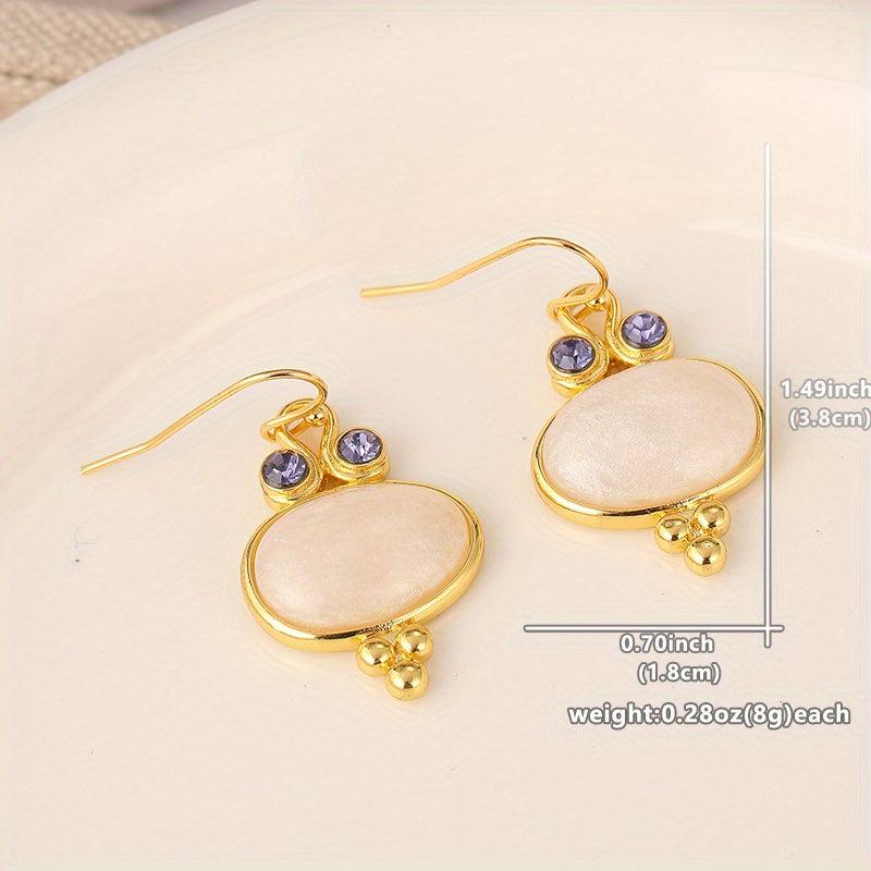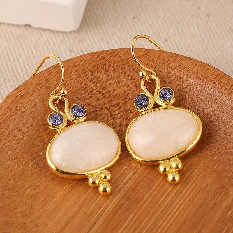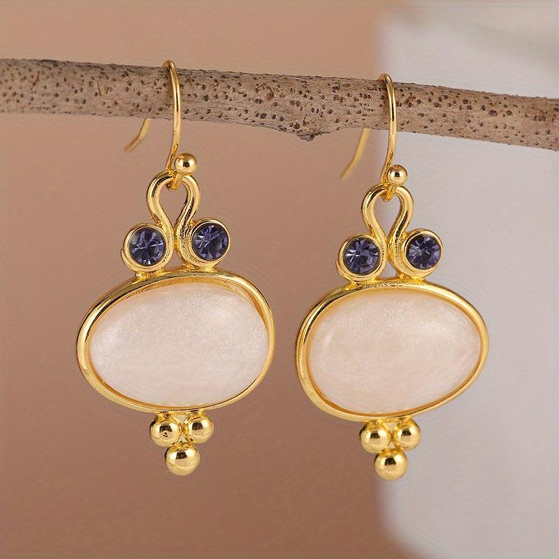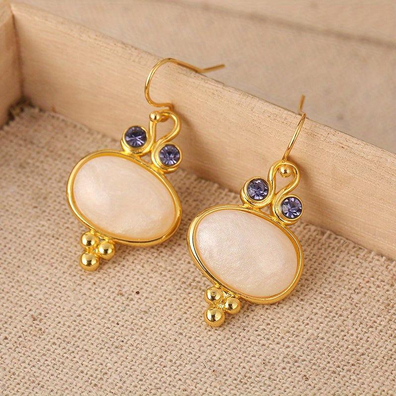 Chic and elegant pair of Bohemian style oval earrings featuring oval stones and cubic zirconia accents. Made of golden plated copper, perfect for weddings and parties.