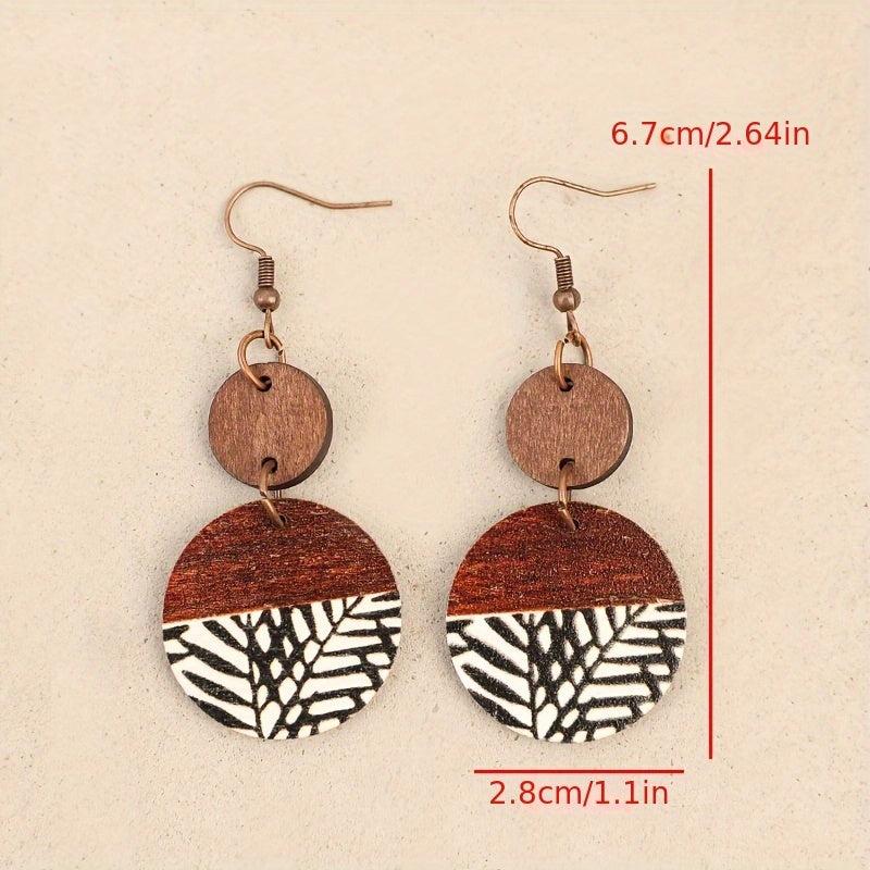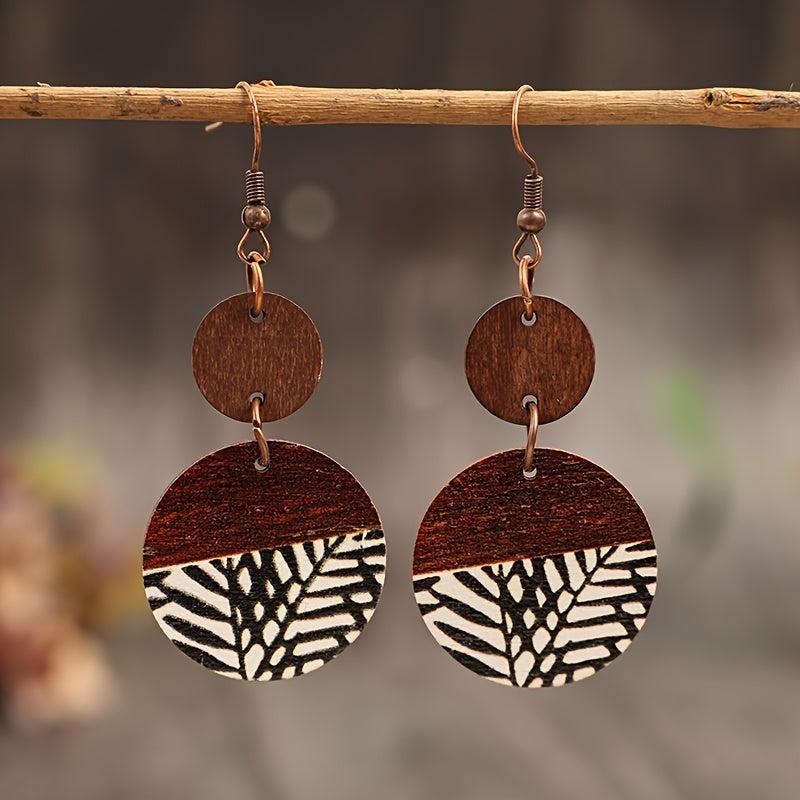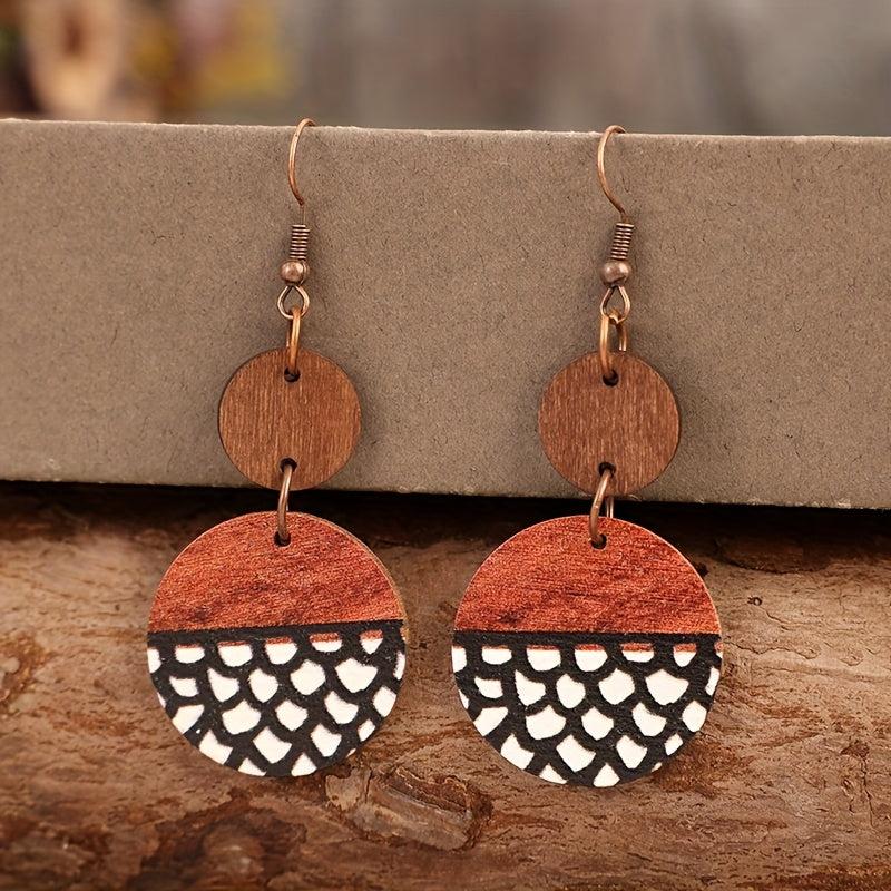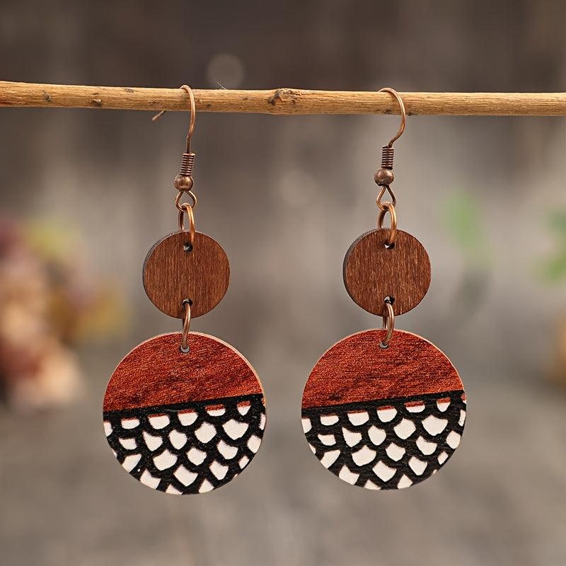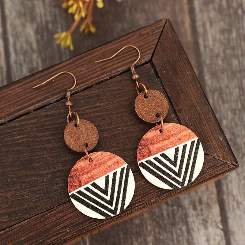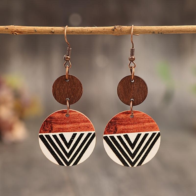 Add a touch of Bohemian retro style with these wooden earrings featuring a geometric print in brown and red stripes, made from natural wood.