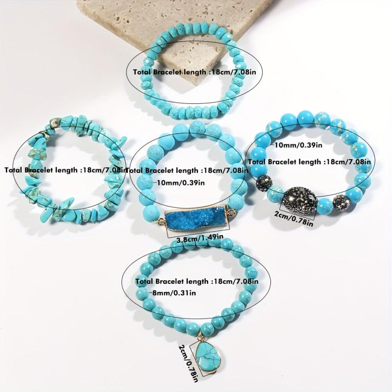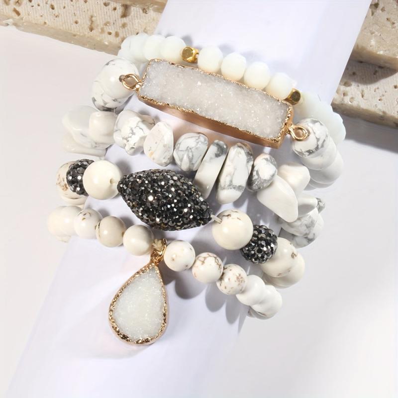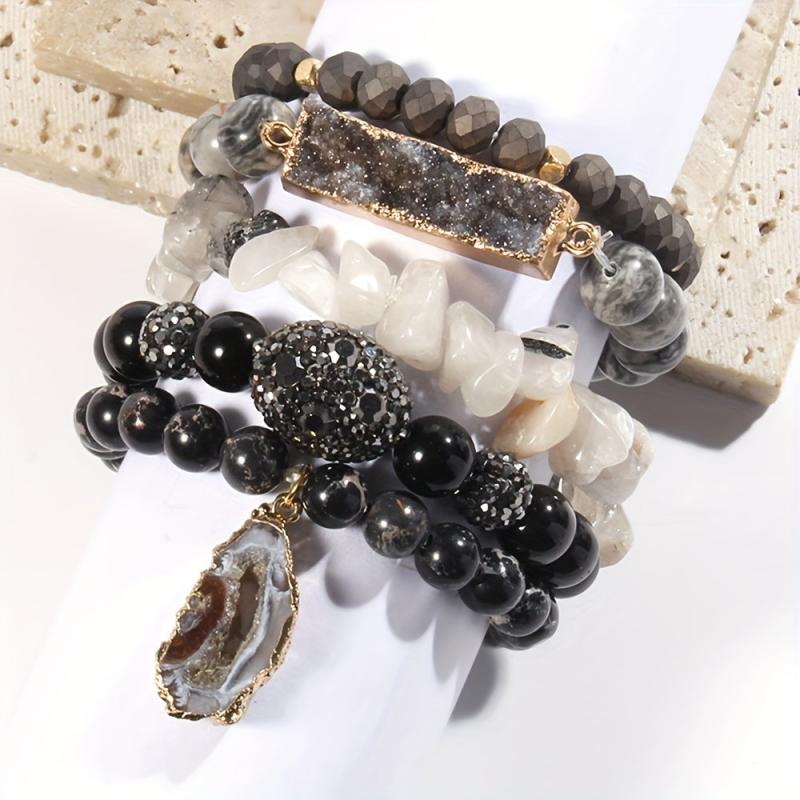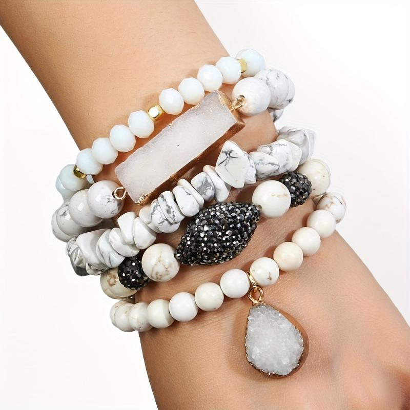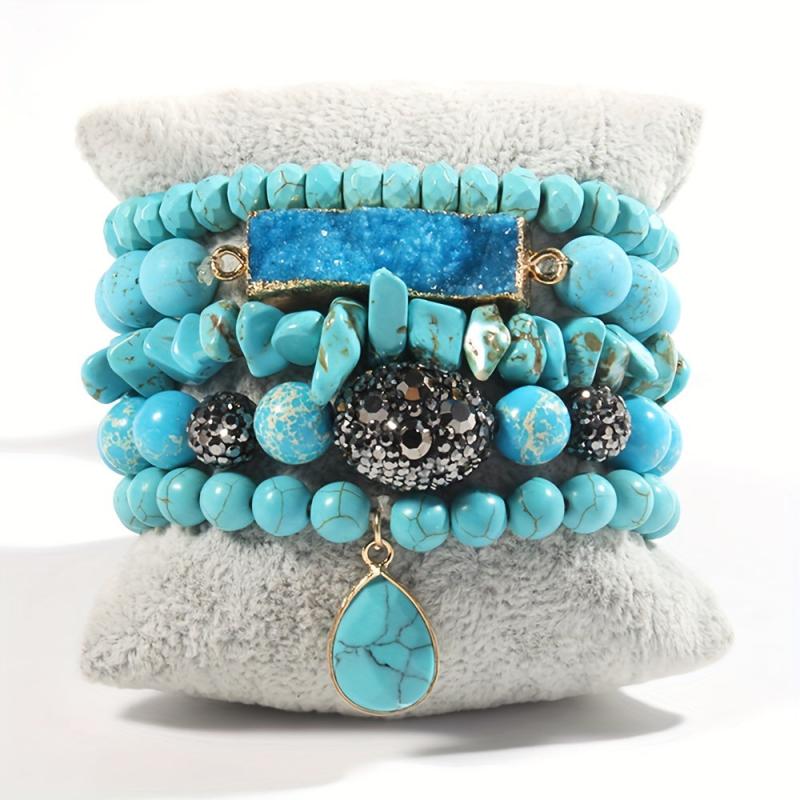 Elevate your style with this set of 5 elastic bracelets featuring natural stone and glass beads. Each bracelet is accented with a rectangular druzy connector drop pendant, adding a touch of bohemian flair to your look.