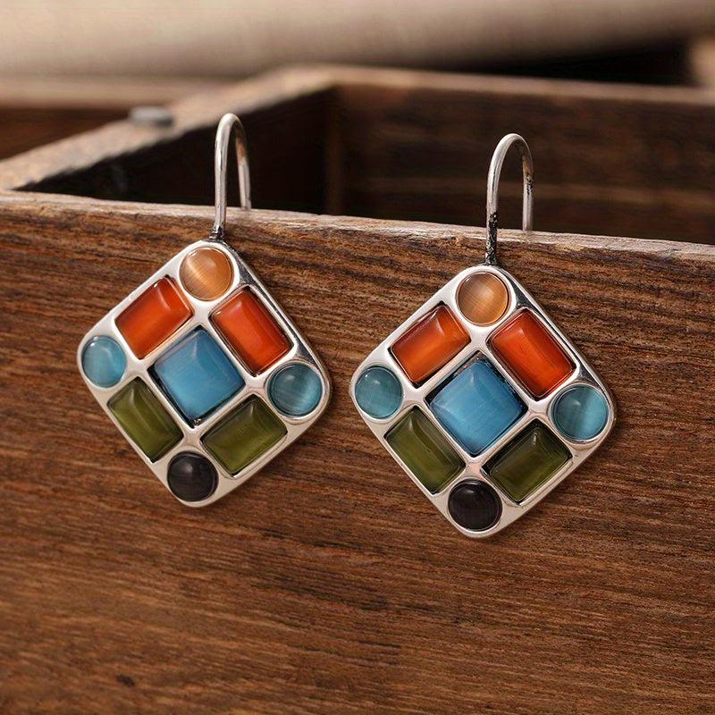 These vintage bohemian square dangle earrings feature a colorful mosaic design with turquoise, orange, green, and purple stones. The earrings are made with copper hooks, making them a perfect gift for women to wear every day.