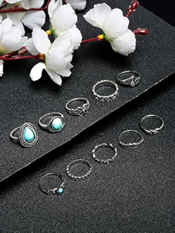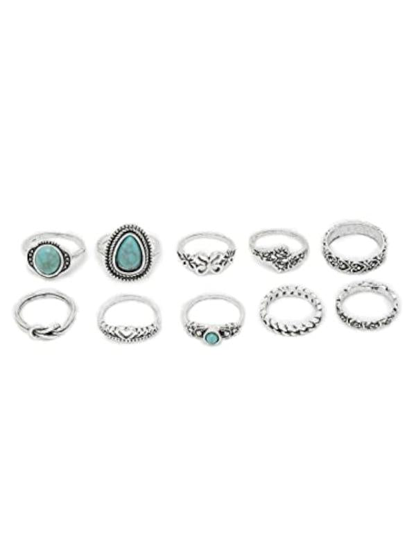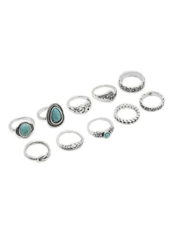 Enhance your bohemian look with this set of 10 unique rings. Made with high-quality materials, these rings are perfect for casual or special occasions.