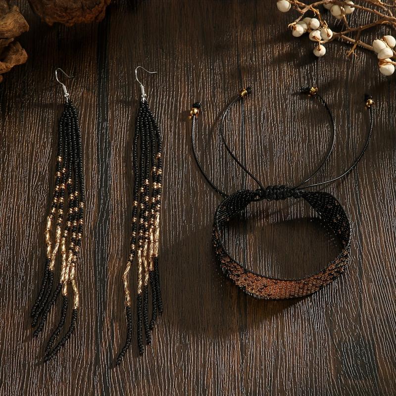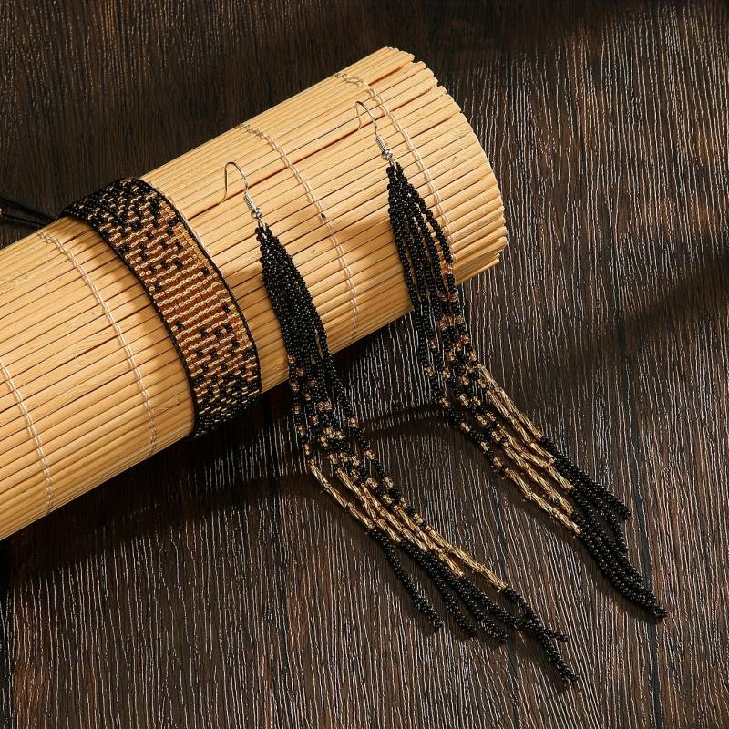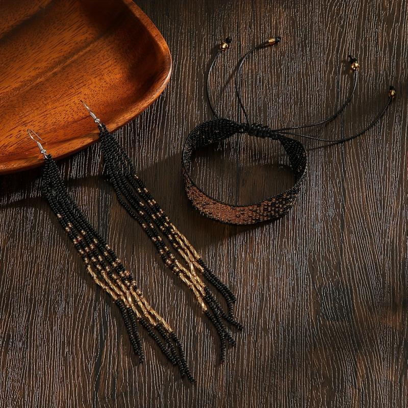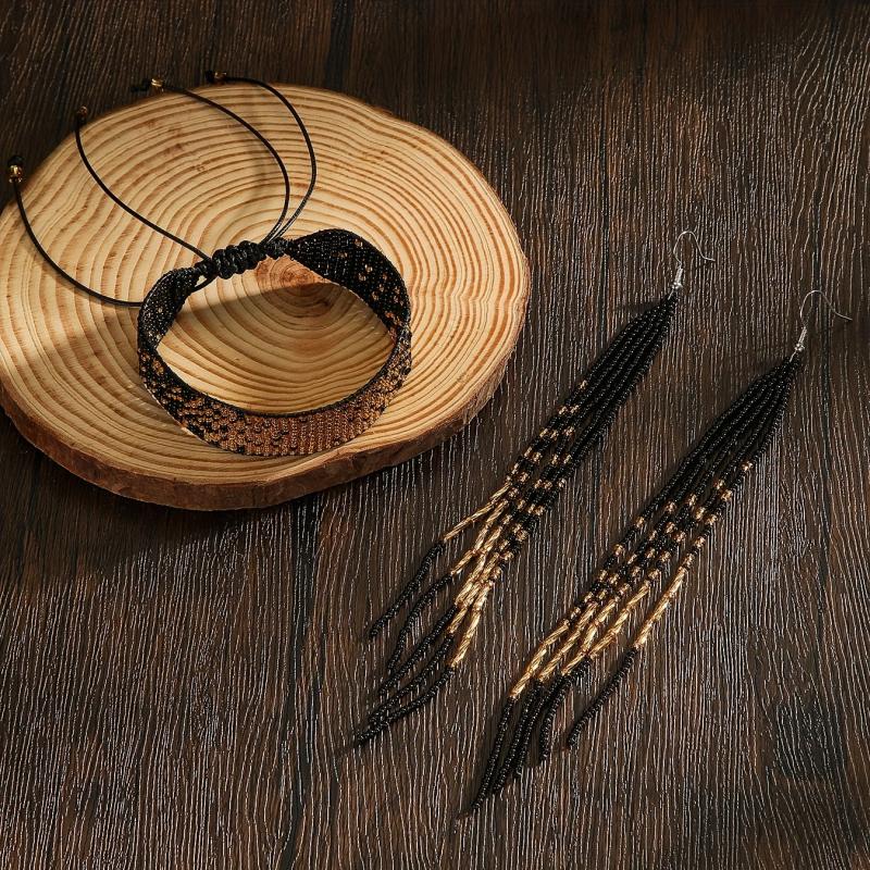 Handcrafted earrings and bracelet with golden gradient pattern. Made of glass seed beads. Perfect bohemian accessory for women.