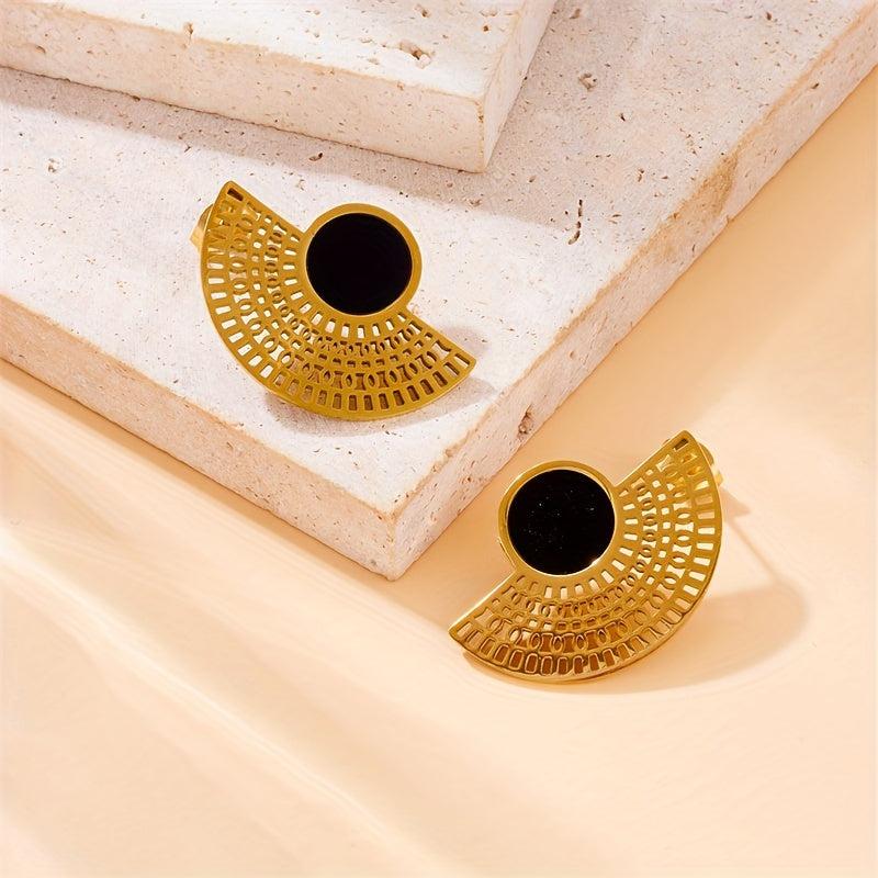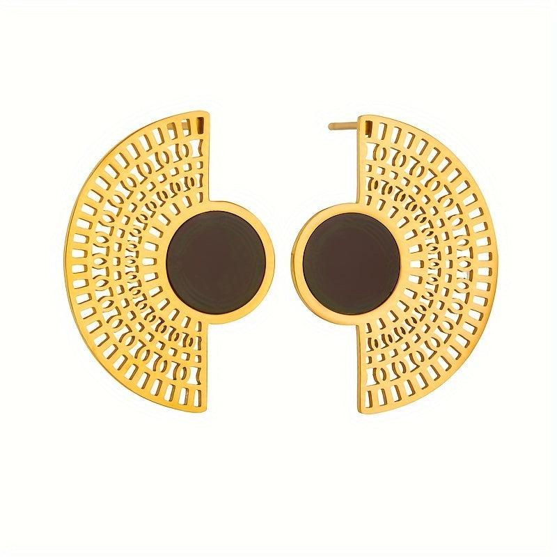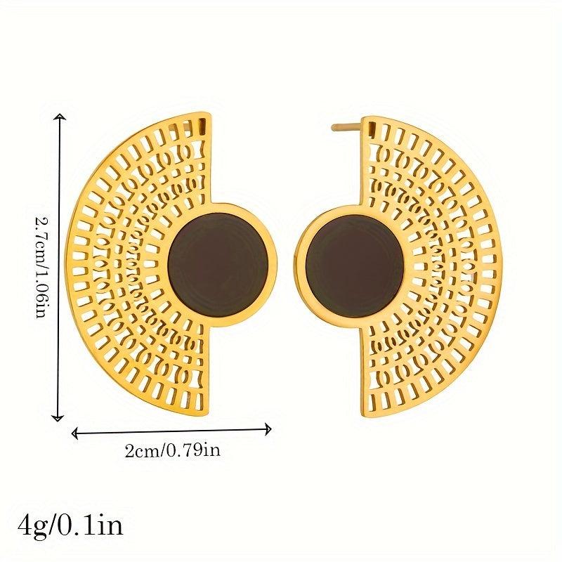 These vintage-inspired earrings feature a goldtone stainless steel fan design with gray resin inlay, perfect for adding a touch of bohemian charm to any outfit. Ideal for parties or as a gift for women.