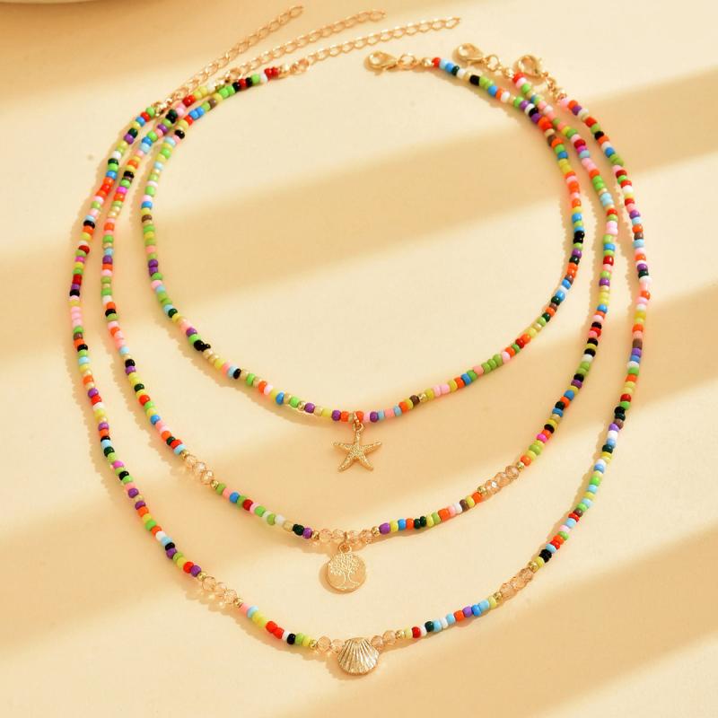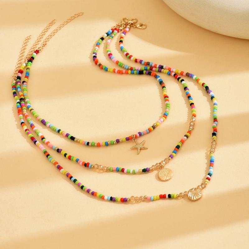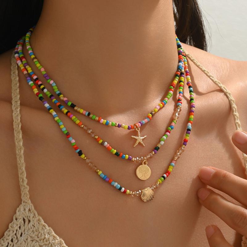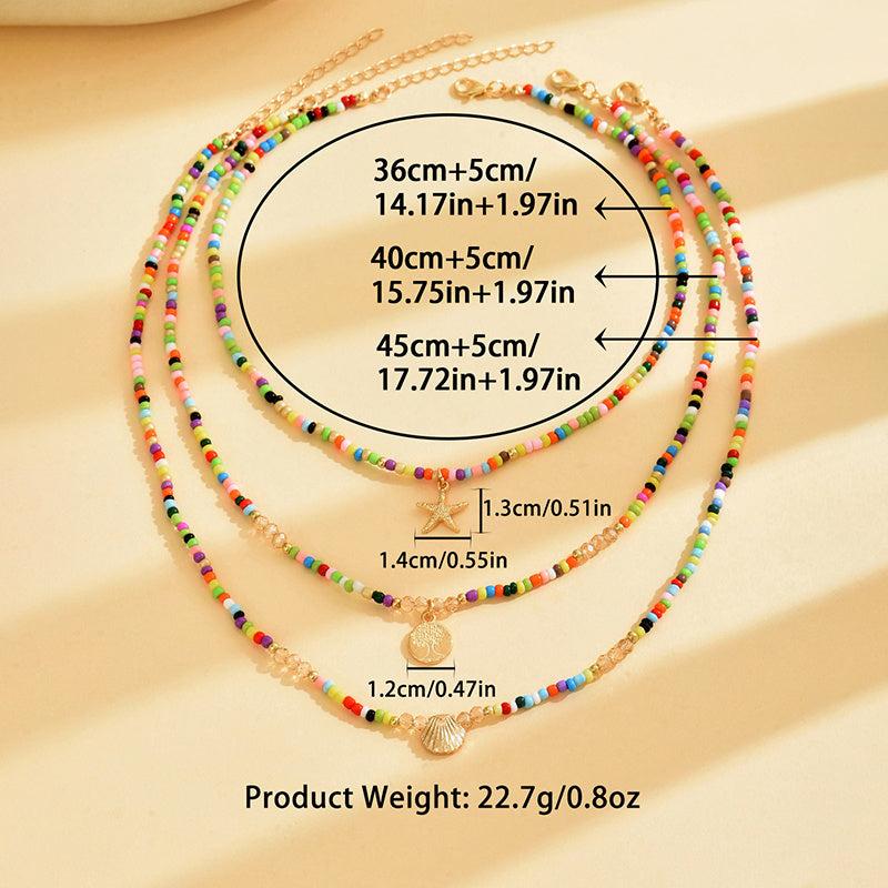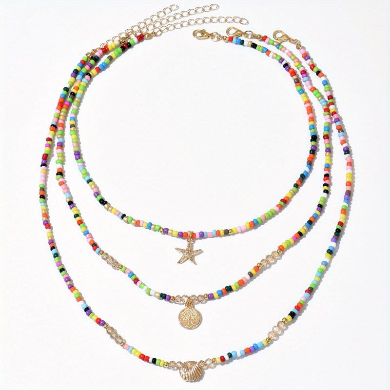 Elevate your looks with this bohemian choker necklace featuring golden shell and starfish pendants, colorful seed bead and round bead hand-woven design with glass materials.
