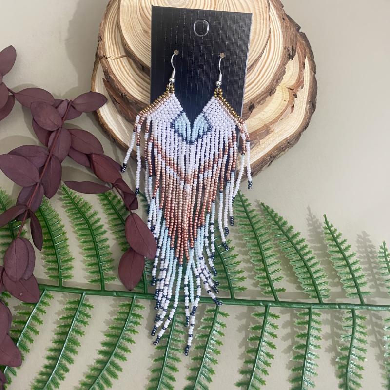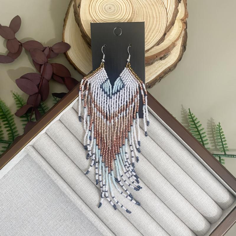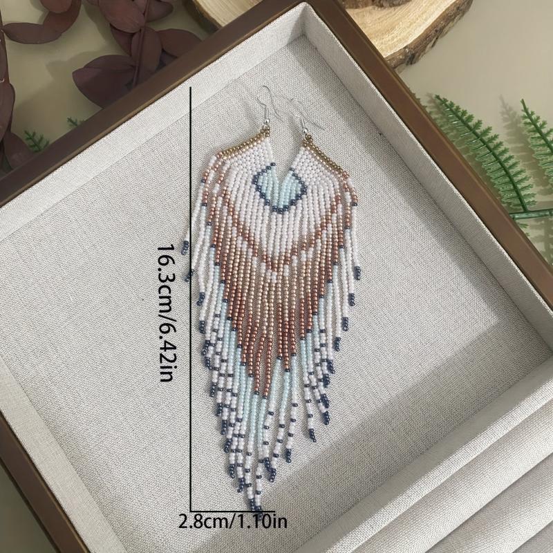 Add a touch of bohemian flair to your outfit with these long tassel earrings featuring a handwoven geometric pattern and glass bead stringing. Perfect for daily wear or vacation, these versatile earrings make a great gift.