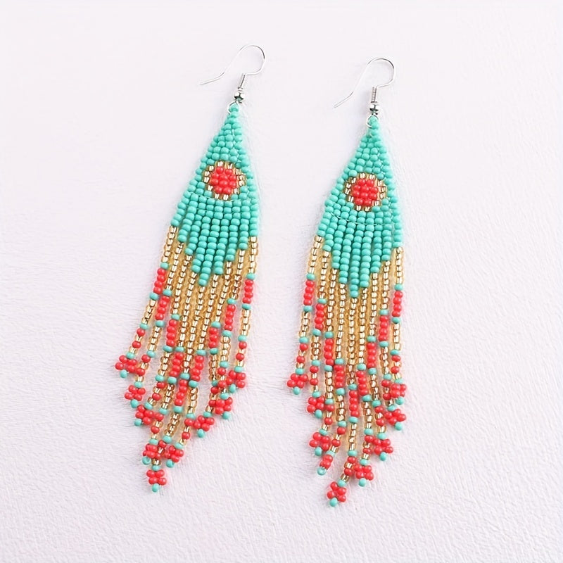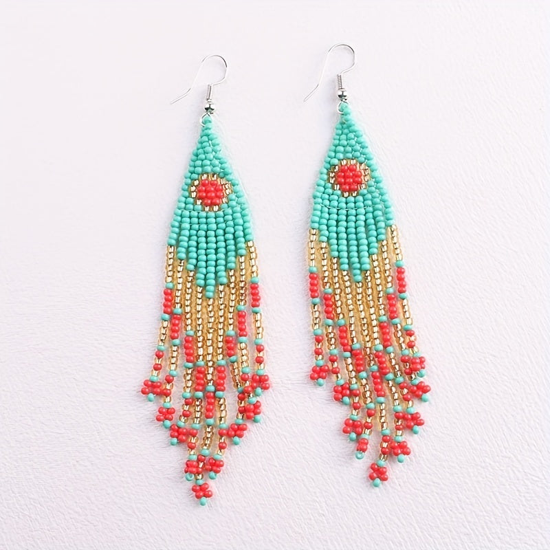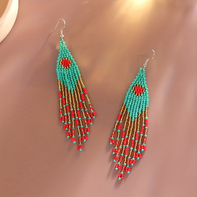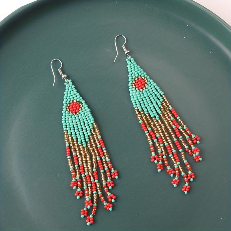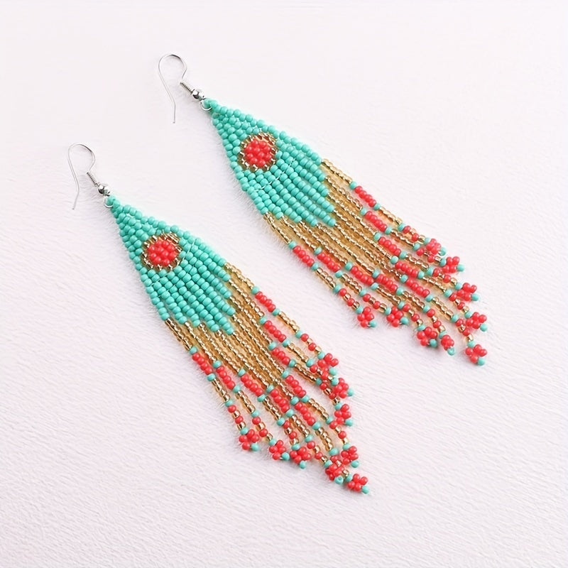 These Bohemian long tassel earrings feature a European and American personalized ethnic style. Each earring is handwoven with rice beads and comes in a pair.