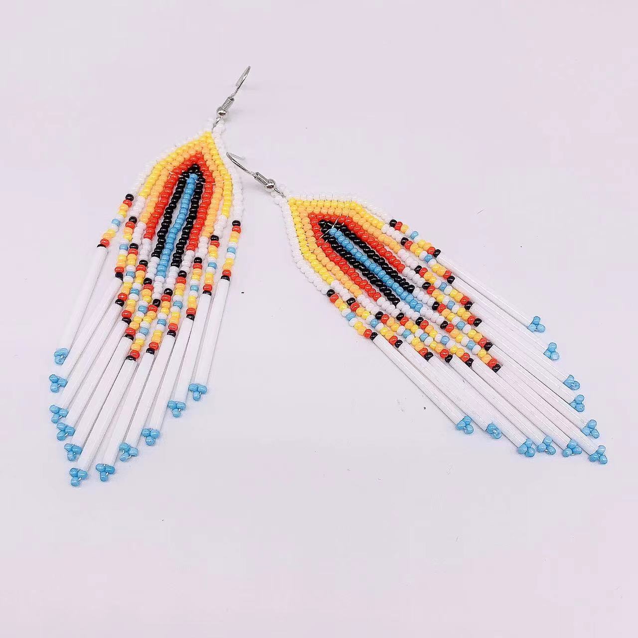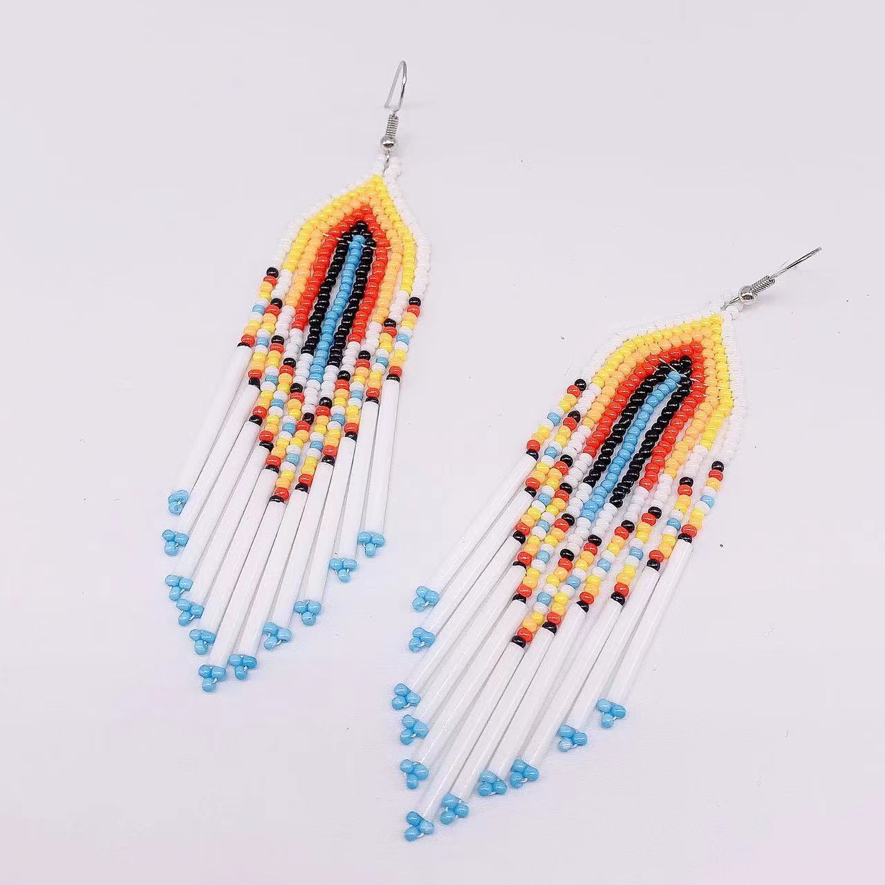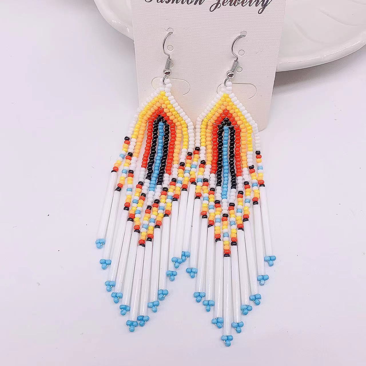 These Bohemian tassel earrings are a European and American hot trend. They feature long brass tubes and rice beads for a stylish look.