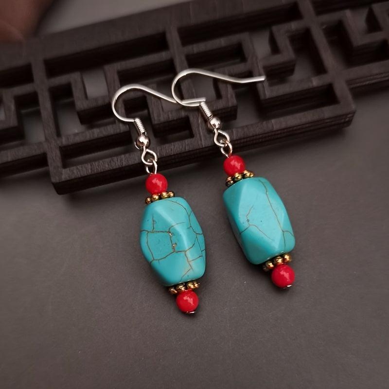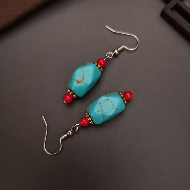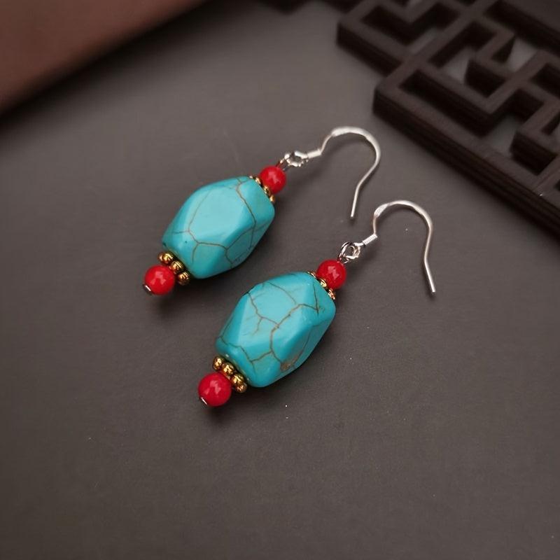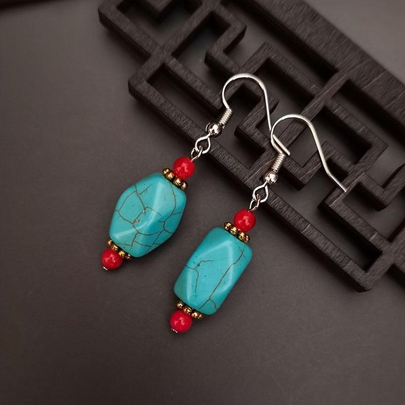 Add a touch of vintage charm to your outfit with these Bohemian Turquoise Dangle Earrings. Perfect for parties and vacations, these earrings feature a unique tribal design with golden accents.