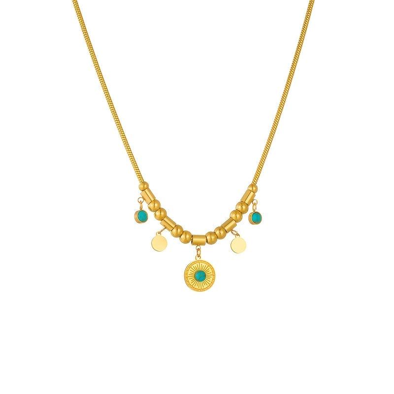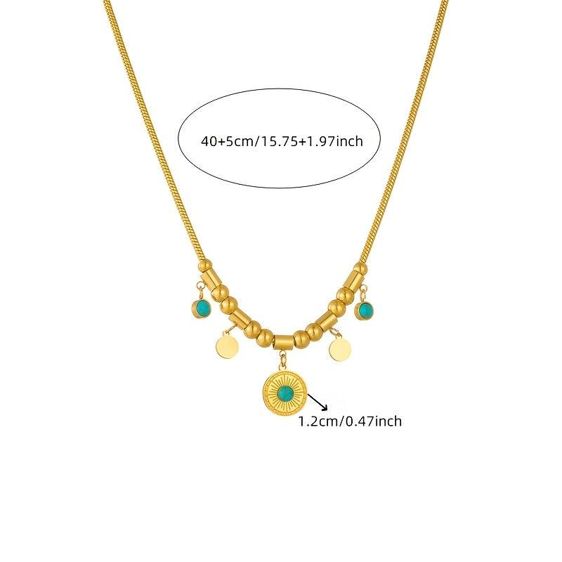 Add a touch of bohemian charm to your look with this stainless steel necklace featuring a round coin turquoise pendant. The vintage golden tone and beaded chain make it perfect for both women and men, ideal for casual attire or as a thoughtful gift.