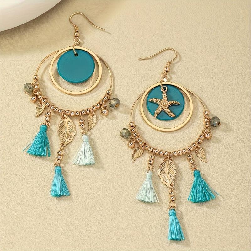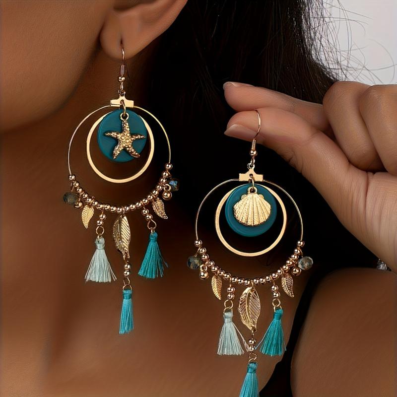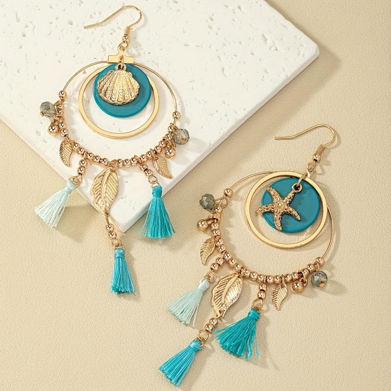 Add a touch of boho style to your summer beach party look with these round asymmetric dangle earrings featuring tassel, hollow circle, metal starfish and shell decor.