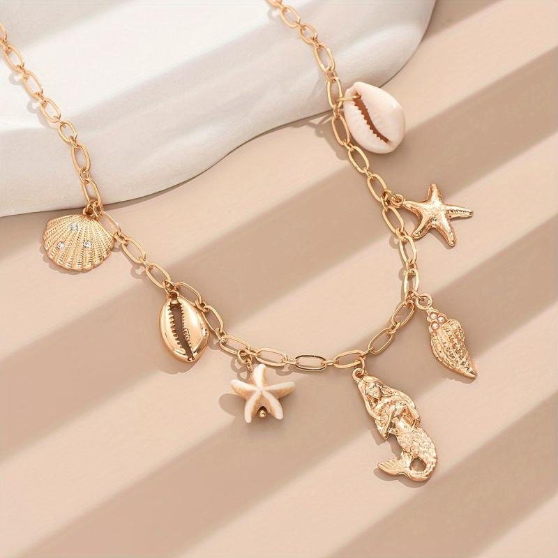 Boho Beach Vacation Charm Necklace with Seashell Starfish Mermaid Pendants